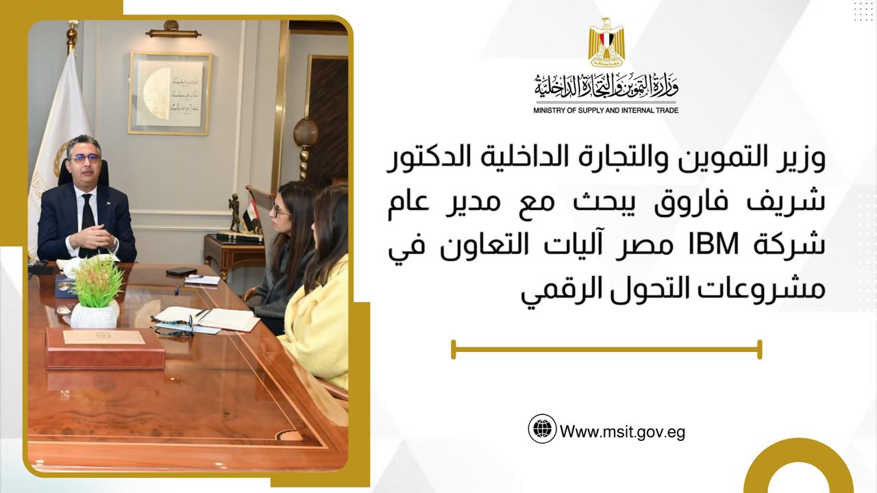بمقر الوزارة بالعاصمة الجديدة استقبل الدكتور شريف فاروق، المهندسة مروة عباس مدير عام شركة IBM مصر، وتناول اللقاء بحث آليات التعاون المشترك بين الوزارة وشركة IBM في عدد من المشروعات الاستراتيجية التي تنفذها وزارة التموين والتجارة الداخلية، وفي مقدمتها مشروعات التحول الرقمي، ومنظومة التتبع (Track & Trace)، والكارت الموحد، وغيرها.