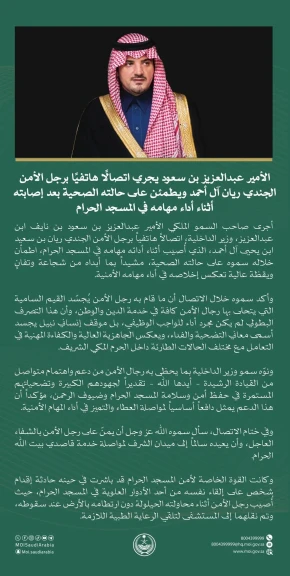 الأمير عبدالعزيز بن سعود وزير الداخلية السعودى يجري اتصالًا هاتفيًا برجل الأمن الجندي ريان آل أحمد ويطمئن على حالته الصحية بعد إصابته أثناء أداء مهامه في المسجد الحرام.
