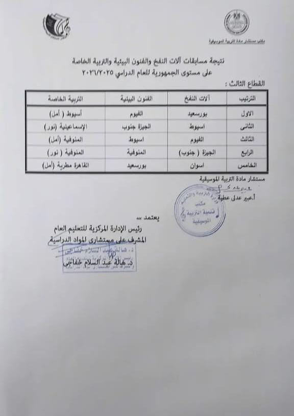 مدير تعليم أسيوط يعلن الفوز ب3 مراكز على مستوى الجمهورية فى مسابقة الات النفخ والفنون البيئية والتربية الخاصة فى التربية الموسيقية