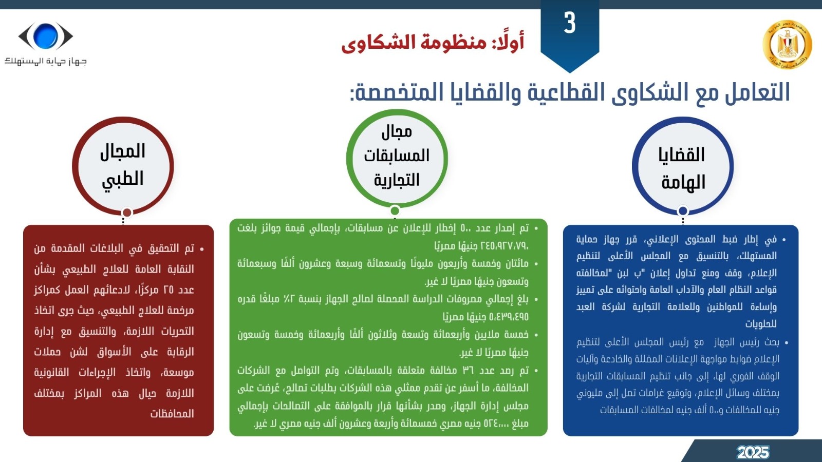 في إطار تطوير منظومة التعامل مع الشكاوى المتخصصة وتعزيز آليات الفحص الفني والقانوني، واصل جهاز حماية المستهلك خلال عام 2025 جهوده في التعامل مع الشكاوى القطاعية وفقًا لطبيعة كل قطاع، بما يضمن سرعة الفصل وحماية حقوق المستهلكين.