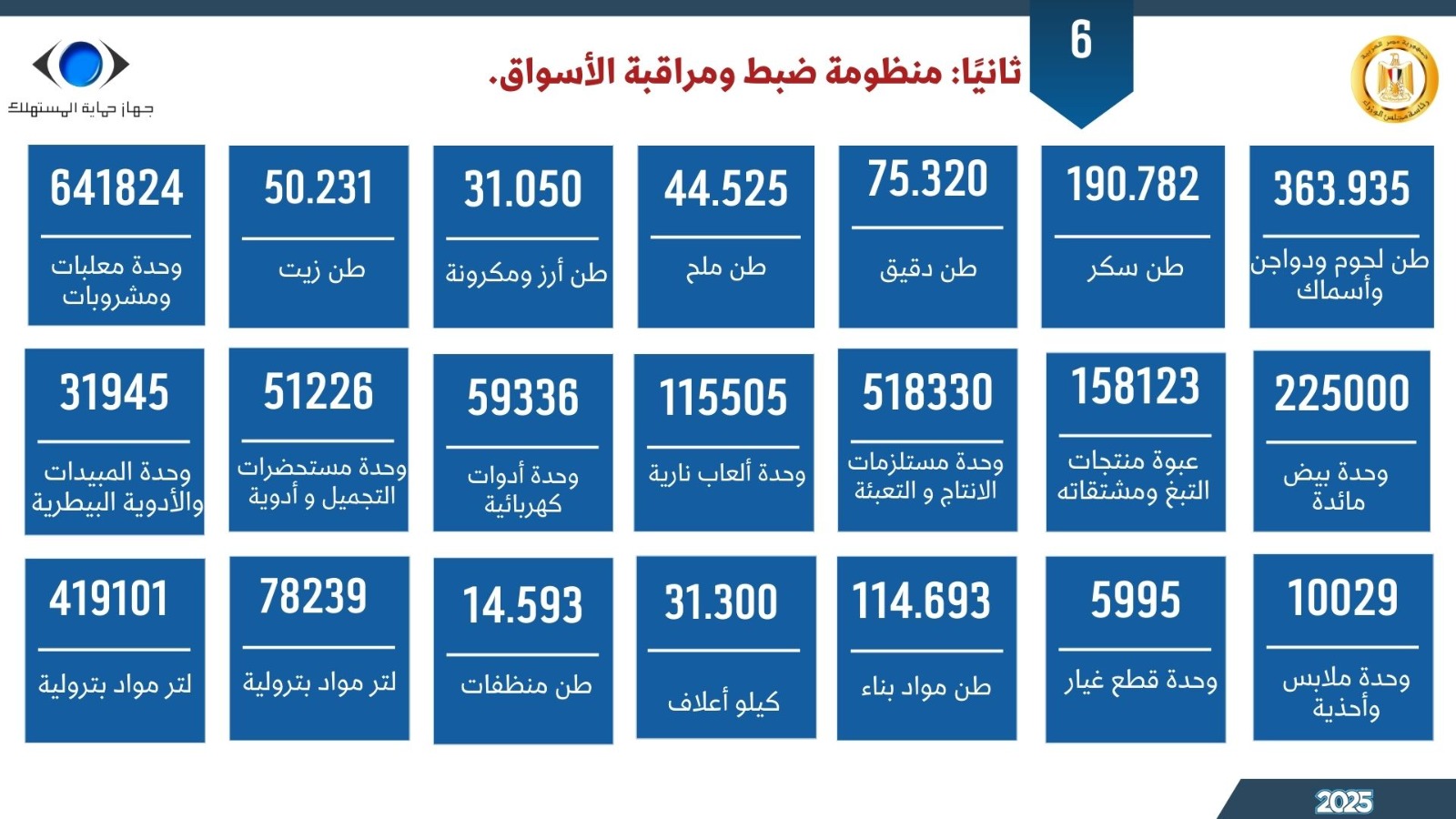 كما أسفرت الحملات عن ضبط كميات كبيرة من المضبوطات شملت نحو 584.545 طن سلع غذائية، و497.340 لتر زيوت سيارات ومواد بترولية مجهولة المصدر، إلى جانب ضبط 225,000 بيضة مائدة غير صالحة للاستهلاك الآدمي، وذلك بالتنسيق الكامل مع كافة الأجهزة الرقابية المعنية بضبط الأسواق، حيث حققت تلك الجهود نتائج إيجابية ساهمت في تحقيق رؤية الجهاز الهادفة إلى صون وحماية حقوق المستهلكين، ومواجهة كافة الممارسات الضارة بالأسواق، وتعزيز دور الجهاز في تطبيق أحكام القانون، والحفاظ على صحة وسلامة المواطنين، وترسيخ القواعد والمعايير اللازمة لضبط الأسواق.