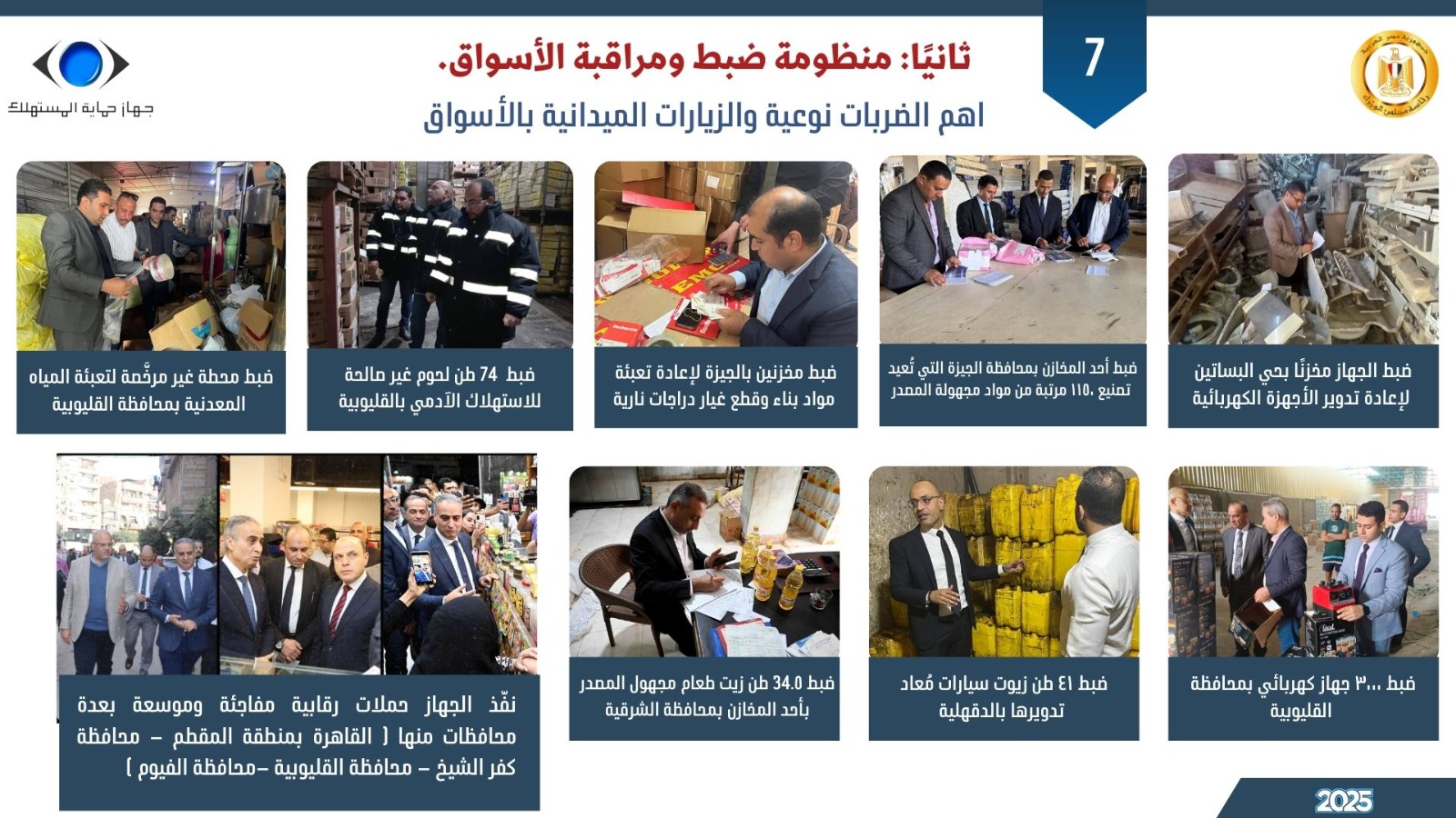 في ضوء تكليفات معالي رئيس مجلس الوزراء بتشديد الرقابة على الأسواق، خاصة أسواق السلع الغذائية، ومواجهة الممارسات الضارة بالأسواق، نفذ جهاز حماية المستهلك وأفرعه الإقليمية 9,436 حملة رقابية شملت 24 محافظة، شملت المرور على 122,097 منشأة، وأسفرت عن ضبط 30,516 قضية متنوعة، أبرزها: عدم الإعلان عن الأسعار، البيع بأزيد من السعر الرسمي، تداول سلع غذائية مجهولة المصدر أو منتهية الصلاحية، وعدم إصدار فواتير للمستهلكين.