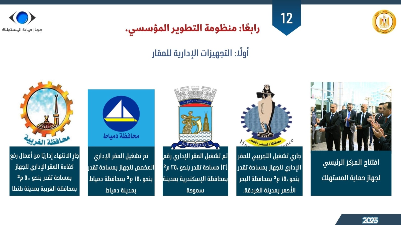 وشمل ذلك تشغيل المقر الإداري رقم (2) بمحافظة الإسكندرية بمدينة سموحة بمساحة تقدر بنحو 250 م²، وتشغيل المقر الإداري المخصص للجهاز بمحافظة دمياط بمدينة دمياط بمساحة تقدر بنحو 150 م²، إلى جانب قرب الانتهاء إداريًا من أعمال رفع كفاءة المقر الإداري للجهاز بمحافظة الغربية بمدينة طنطا بمساحة تقدر بنحو 500 م².