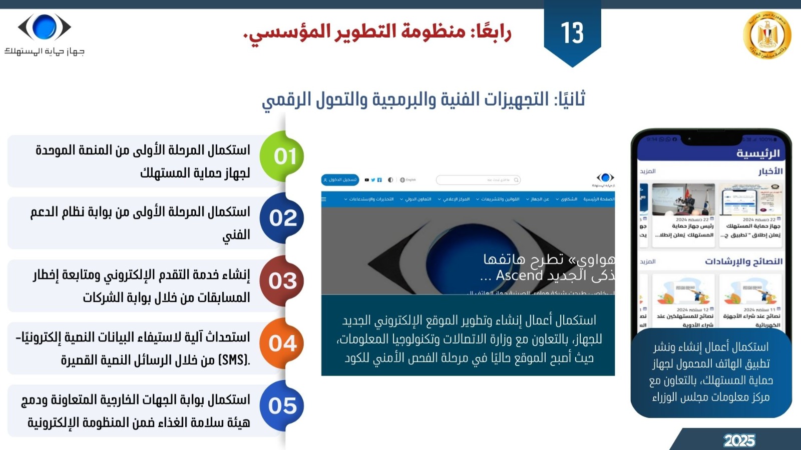 كما تم استكمال المرحلة الأولى من المنصة الموحدة لجهاز حماية المستهلك، والمرحلة الأولى من بوابة نظام الدعم الفني، إلى جانب إنشاء خدمة التقدم الإلكتروني ومتابعة إخطار المسابقات من خلال بوابة الشركات، واستحداث آلية لاستيفاء البيانات النصية إلكترونيًا عبر الرسائل النصية القصيرة (SMS).
