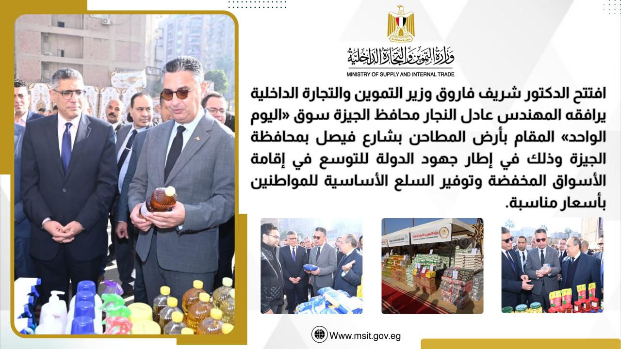 افتتح الدكتور شريف فاروق وزير التموين والتجارة الداخلية، يرافقه المهندس عادل النجار محافظ الجيزة، سوق اليوم الواحد بمنطقة فيصل بمحافظة الجيزة، وذلك في إطار جهود الدولة للتوسع في إقامة الأسواق المخفضة وتوفير السلع الأساسية للمواطنين بأسعار مناسبة.