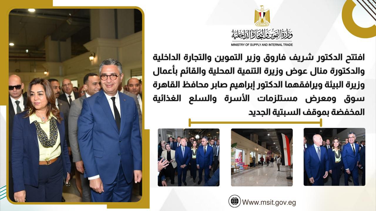 افتتح الدكتور شريف فاروق وزير التموين والتجارة الداخلية، والدكتورة منال عوض وزيرة التنمية المحلية والقائم بأعمال وزيرة البيئة ويرافقهما الدكتور إبراهيم صابر محافظ القاهرة، سوق ومعرض مستلزمات الأسرة والسلع الغذائية المخفضة بموقف السبتية الجديد، الثلاثاء الموافق 30 ديسمبر، وذلك في إطار جهود الدولة للتوسع في إقامة الأسواق والمنافذ السلعية لتوفير السلع الغذائية والأساسية للمواطنين بأسعار مناسبة، والحد من حلقات التداول الوسيطة.