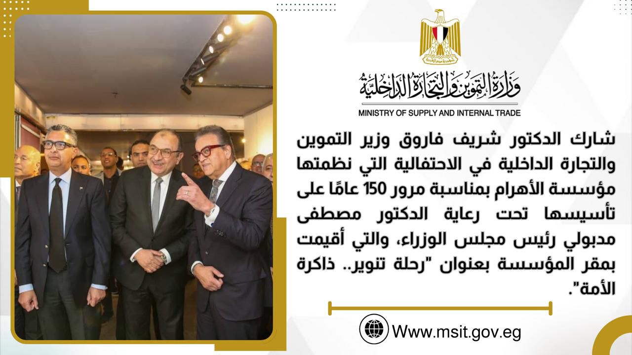 شارك الدكتور شريف فاروق، وزير التموين والتجارة الداخلية في الاحتفالية التي نظمتها مؤسسة الأهرام بمناسبة مرور 150 عامًا على تأسيسها، تحت رعاية الدكتور مصطفى مدبولي رئيس مجلس الوزراء، والتي أقيمت بمقر المؤسسة بعنوان "رحلة تنوير.. ذاكرة الأمة".