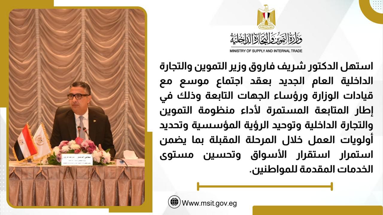 في تأكيد واضح على أهمية تكامل الأدوار بين مختلف مستويات الإدارة وصناعة القرار، استهل الدكتور شريف فاروق، وزير التموين والتجارة الداخلية، العام الجديد بعقد اجتماع موسع مع قيادات الوزارة ورؤساء الجهات التابعة، وذلك في إطار المتابعة المستمرة لأداء منظومة التموين والتجارة الداخلية، وتوحيد الرؤية المؤسسية، وتحديد أولويات العمل خلال المرحلة المقبلة، بما يضمن استمرار استقرار الأسواق وتحسين مستوى الخدمات المقدمة للمواطنين،
