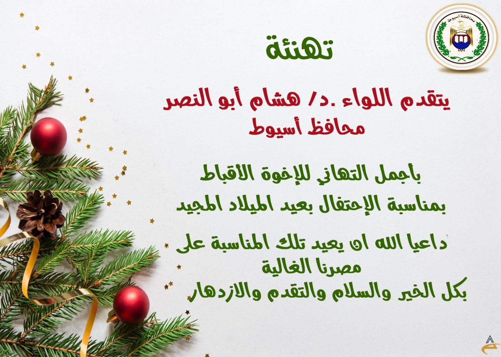 محافظ أسيوط يهنئ البابا تواضروس الثاني والأخوة الأقباط بمناسبة عيد الميلاد المجيد