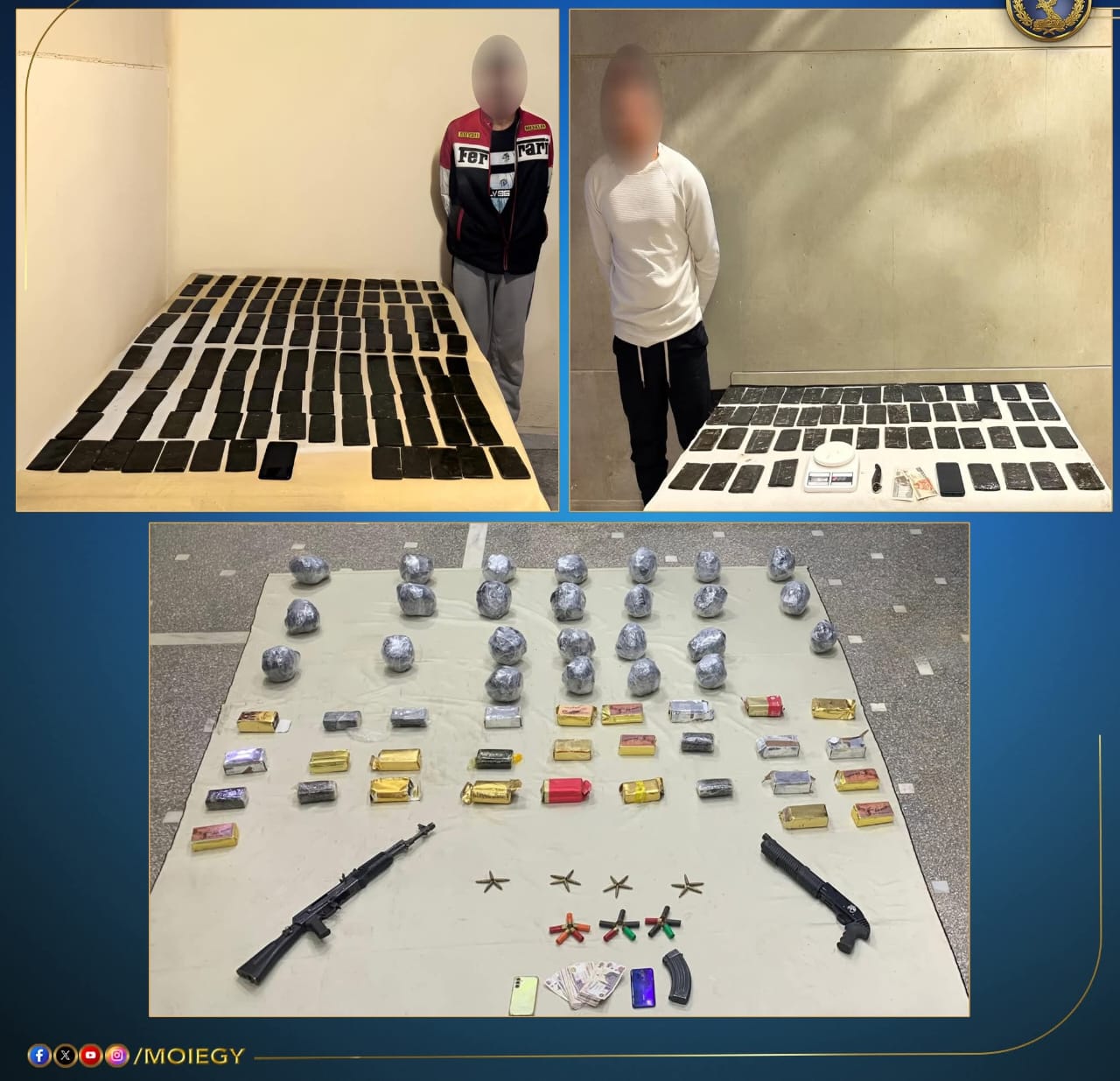 فى إطار مواصلة وزارة الداخلية توجيه الضربات الإستباقية للبؤر الإجرامية جالبى ومتجرى المواد المخدرة وحائزى الأسلحة النارية غير المرخصة فقد أكدت معلومات وتحريات قطاع مكافحة المخدرات والأسلحة والذخائر غير المرخصة بالتنسيق مع أجهزة الوزارة المعنية قيام بؤر إجرامية بنطاق عدد من المحافظات تضم عناصر جنائية شديدة الخطورة بجلب كميات من المواد المخدرة تمهيداً للإتجار بها وحيازة الأسلحة النارية غير المرخصة عقب تقنين الإجراءات تم إستهدافهم بمشاركة قطاع الأمن المركزى وقد أسفر التعامل عن مصرع عنصرين جنائيين شديدى الخطورة سبق الحكم عليهما بالسجن فى جنايات مخدرات سلاح بدون ترخيص ، سرقة بالإكراه بنطاق محافظة "الشرقية" وضبط باقى عناصر تلك البؤر.. وبحوزتهم قرابة طن من المواد المخدرة المتنوعة حشيش ،وهيدرو وشابو وهيروين وعدد من الأسلحة النارية هذا وتقدر القيمة المالية للمواد المخدرة المضبوطة قرابة 83 مليون جنيه تم إتخاذ الإجراءات القانونية.