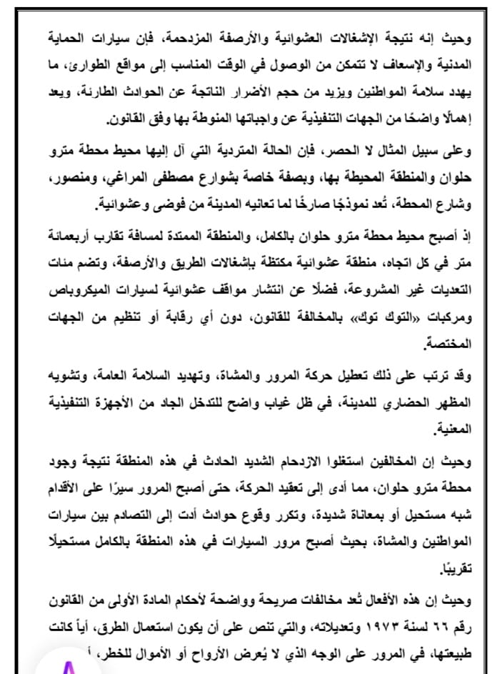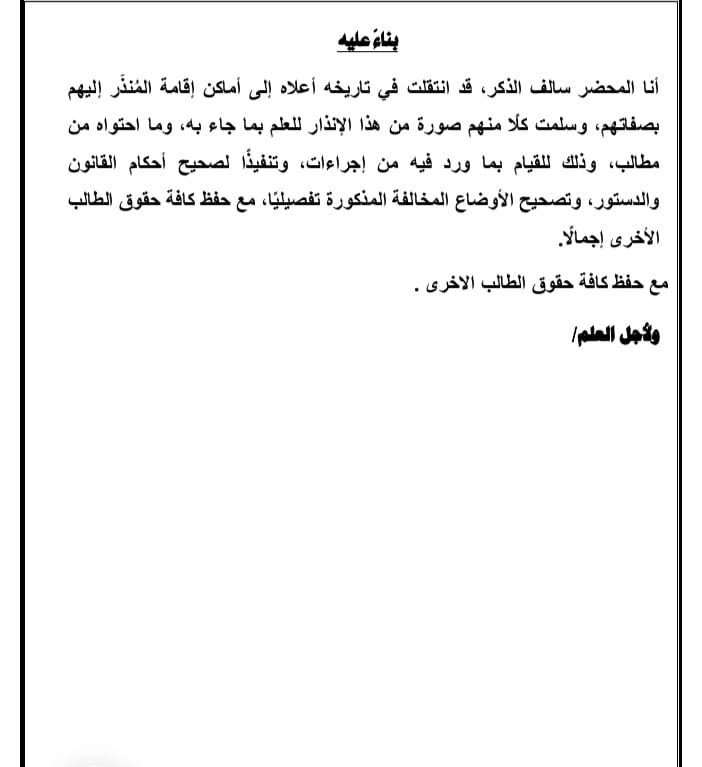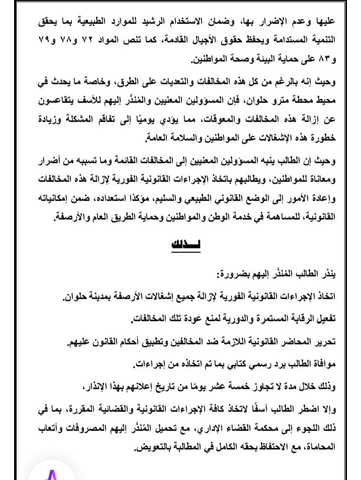 واختتم الإنذار بالتأكيد على أن الهدف من اللجوء للإجراءات القانونية هو حماية حق المواطنين في طريق آمن وبيئة حضرية منظمة، مع الاحتفاظ بحقه الكامل في اتخاذ كافة الإجراءات القانونية حال عدم الاستجابة لمضمون الإنذار.