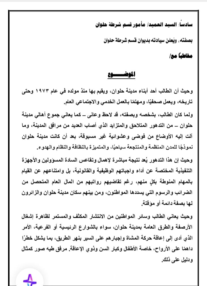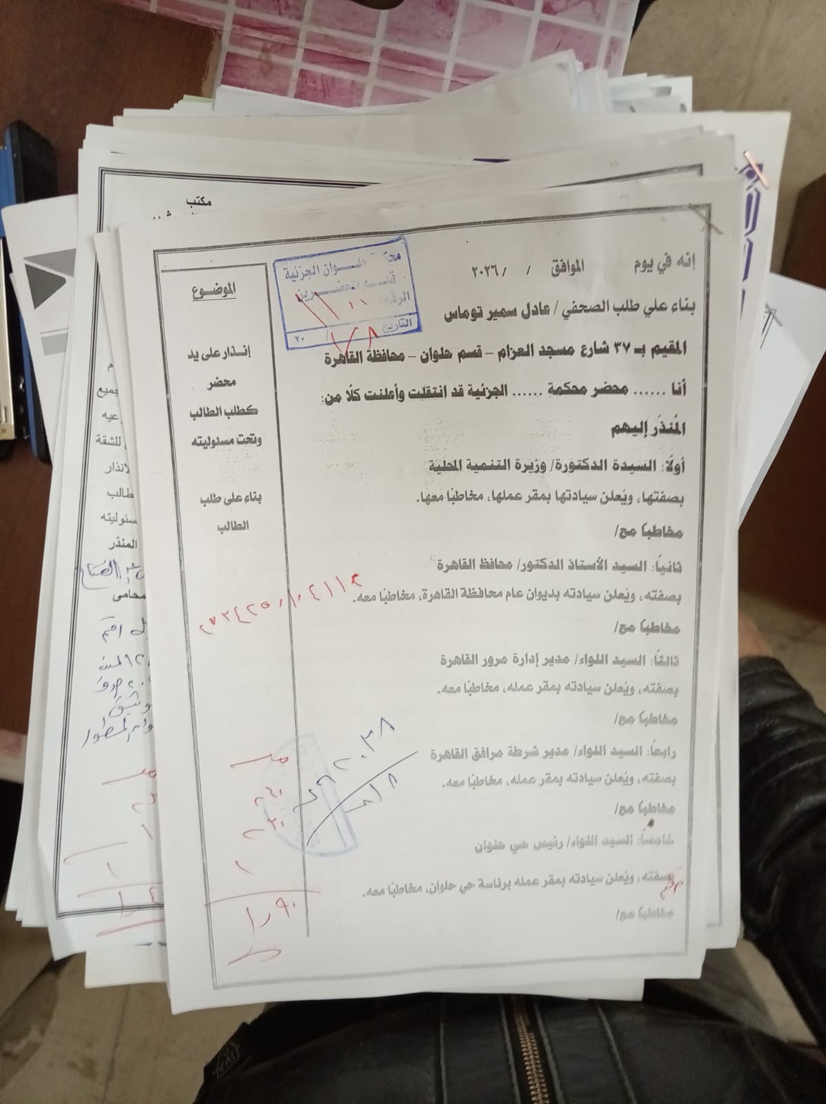 وشمل الإنذار كلًا من وزيرة التنمية المحلية، ومحافظ القاهرة، ومدير إدارة مرور القاهرة، ومدير شرطة مرافق القاهرة، ورئيس حي حلوان، ومأمور قسم شرطة حلوان، مطالبًا إياهم بالتدخل العاجل لإزالة إشغالات الأرصفة والمخالفات التي تعيق الحركة اليومية للمواطنين.