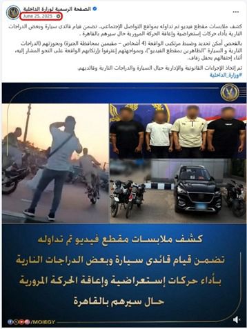 بالنسبة لمقطع فيديو تم نشره بإحدى القنوات الفضائية العربية نقلاً عن صفحة منسوبة لهيئة الإسعاف المصرية بمواقع التواصل الإجتماعى تضمن قيام عدد من الأشخاص بآداء حركات إستعراضية بدراجات نارية وإحدى السيارات وإعاقتهم الحركة المرورية خلال تواجدهم بحفل زفاف بكورنيش النيل بالقاهرة. بالفحص تبين أن مقطع الفيديو المشار إليه قديم سبق تداوله خلال شهر يونيو عام 2025 .. وقد تم فحصه آنذاك وإتخاذ الإجراءات القانونية حيال مرتكبى الواقعة فى حينه، ونشر بيان بمضمون الفحص بالصفحة الرسمية لوزارة الداخلية.