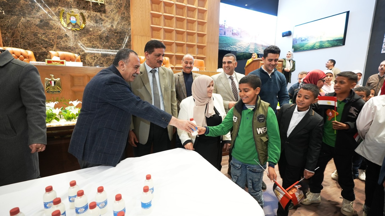 كما قام المحافظ بتسليم دروع تكريم لعدد من الجهات والشخصيات الداعمة، تقديرًا لدورهم المجتمعي وجهودهم الداعمة، كما تم توزيع زجاجات اللبن على الأطفال المتواجدين بالقاعة إيذانًا بالانطلاق الرسمي لمبادرة "كوب لبن لكل طفل"، وسط تفاعل إيجابي من الحضور.