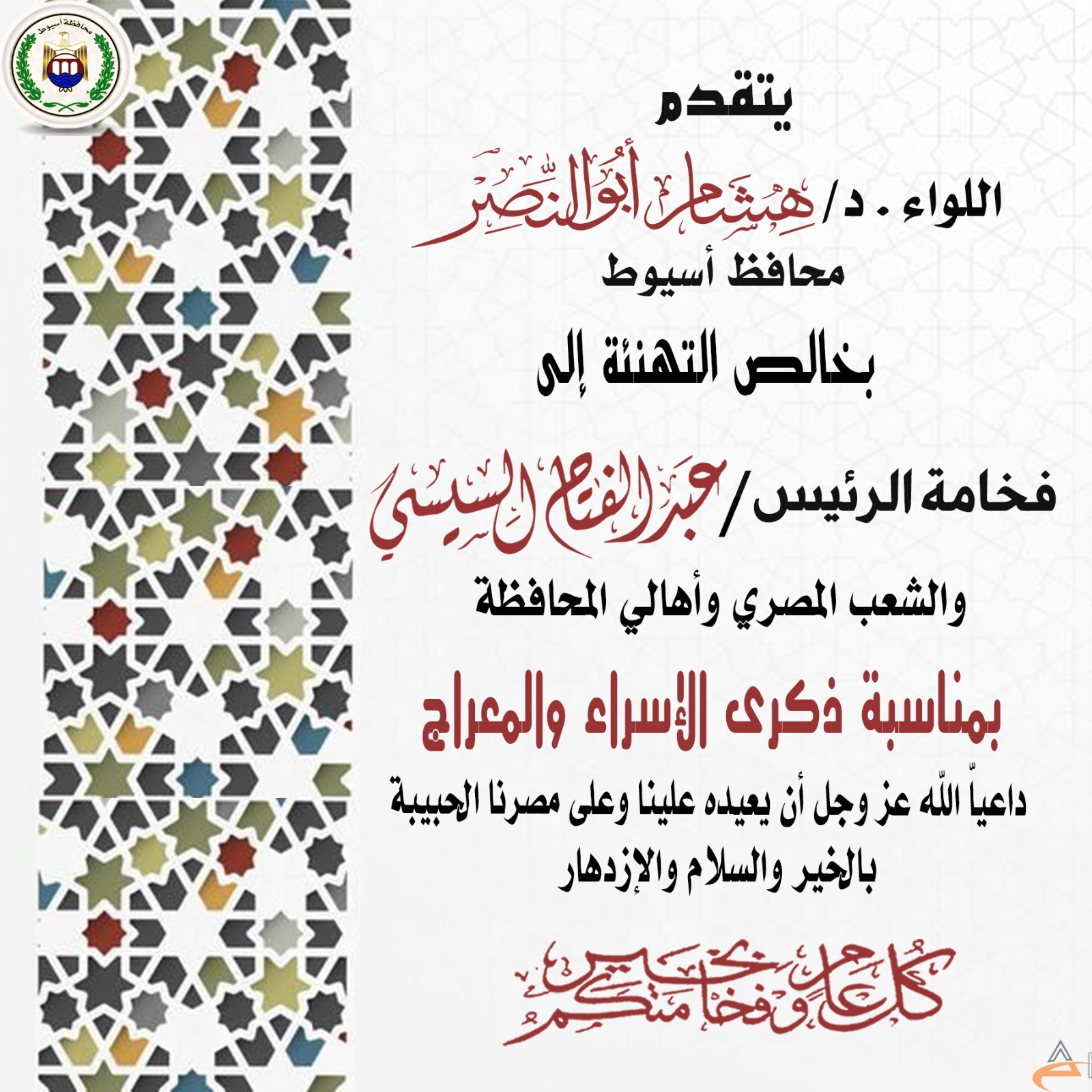 محافظ أسيوط يهنئ الرئيس عبد الفتاح السيسي وقيادات الدولة بمناسبة ذكرى الإسراء والمعراج