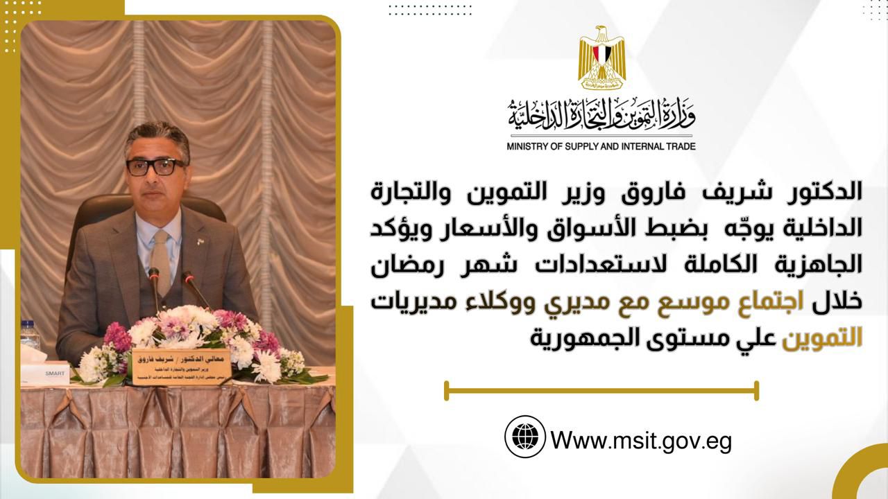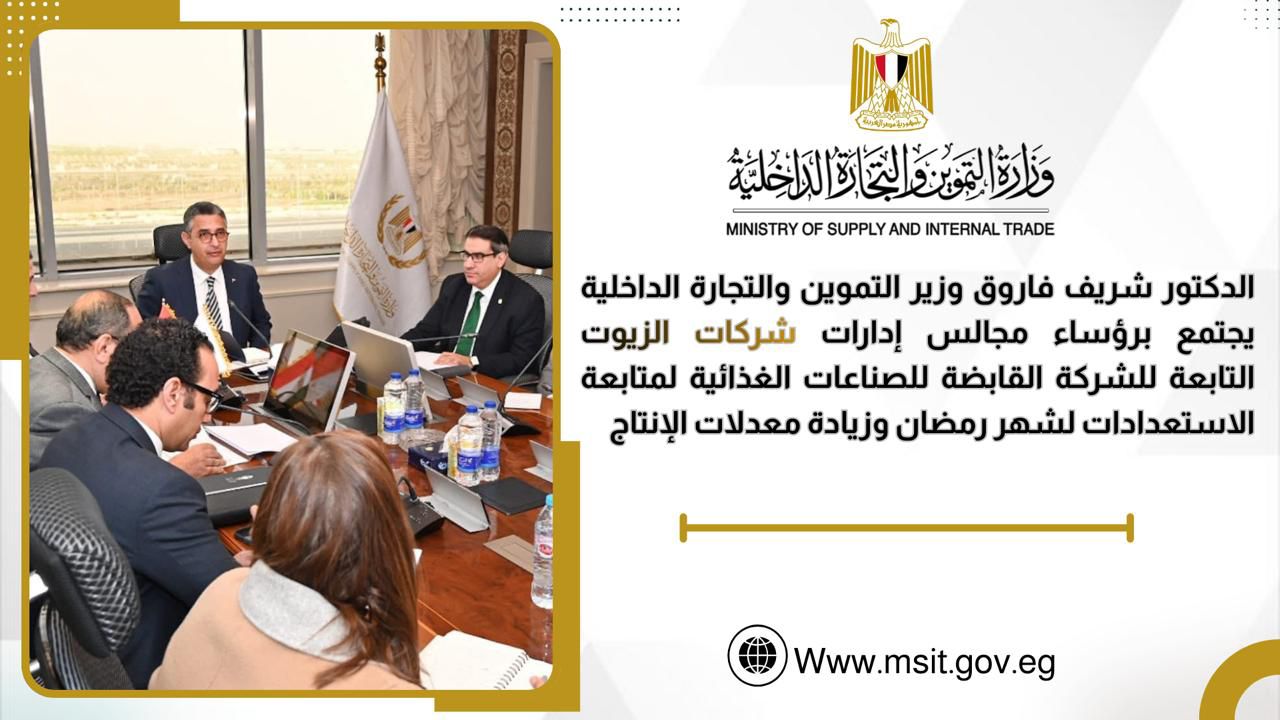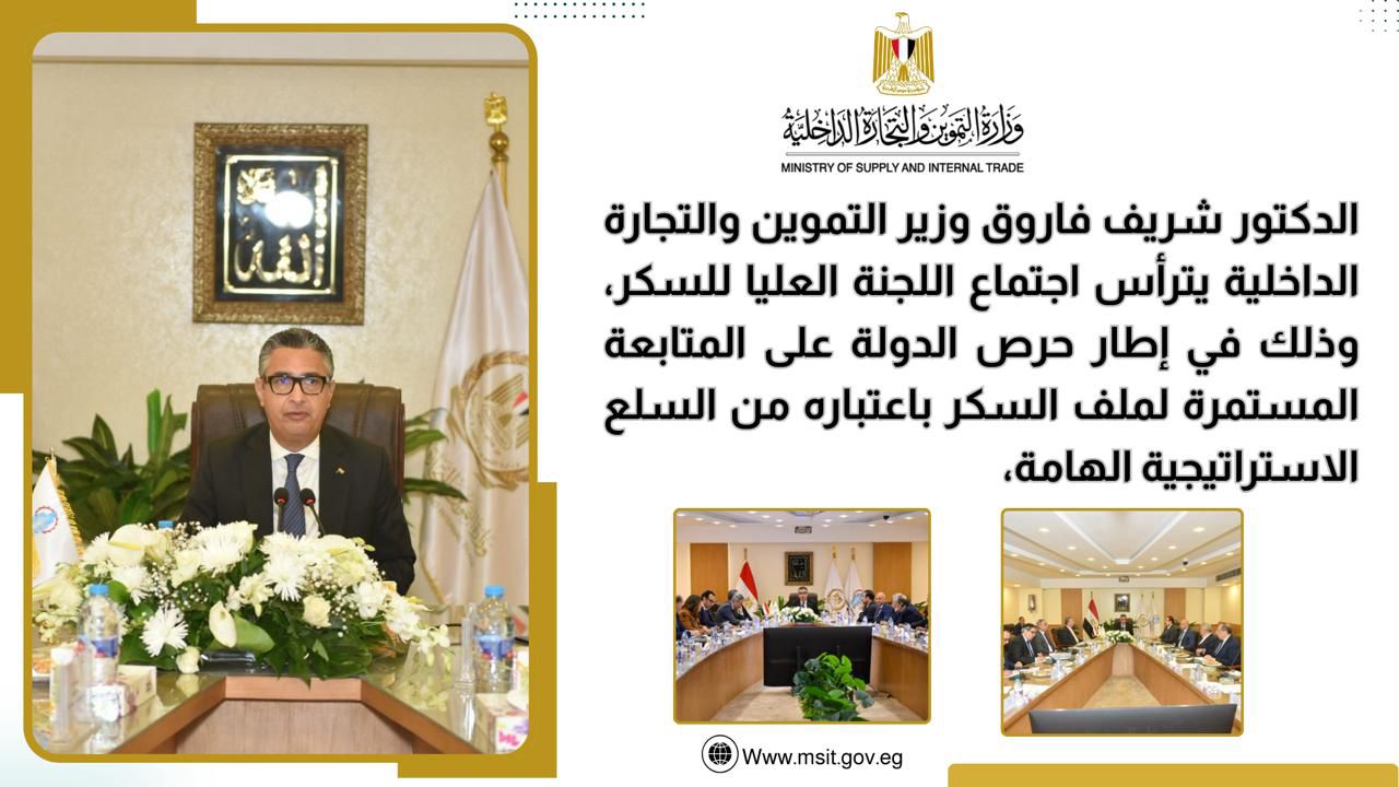 الدكتور شريف فاروق وزير التموين والتجارة الداخلية يترأس اجتماع اللجنة العليا للسكر، وذلك في إطار حرص الدولة على المتابعة المستمرة لملف السكر باعتباره من السلع الاستراتيجية الهامة، وضمان استقرار تداوله وتوافره في الأسواق بما يحقق التوازن بين الإنتاج المحلي والاحتياجات الاستهلاكية.