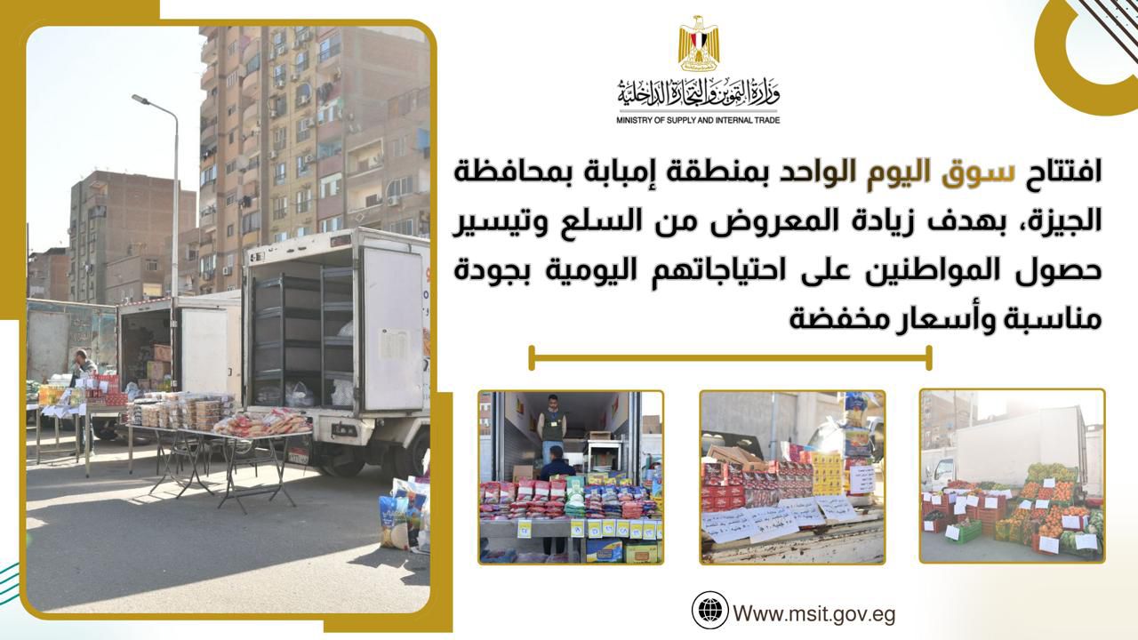 استمرارا لجهود وزارة التموين والتجارة الداخلية في إقامة أسواق اليوم الواحد وتوفير السلع الغذائية والأساسية للمواطنين بأسعار مناسبة، تم افتتاح سوق اليوم الواحد بمنطقة إمبابة بمحافظة الجيزة، بهدف زيادة المعروض من السلع وتيسير حصول المواطنين على احتياجاتهم اليومية بجودة مناسبة وأسعار مخفضة.