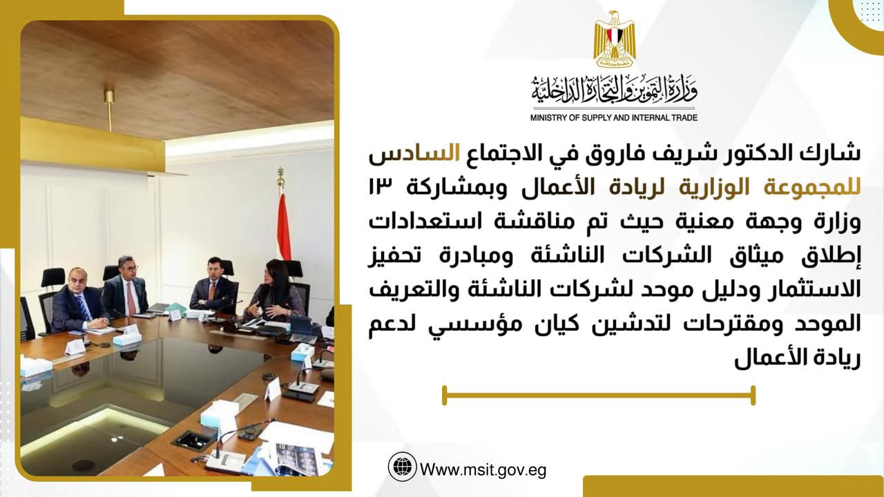 تنفيذًا لتكليفات الدكتور مصطفى مدبولي رئيس الوزراء بشأن الرؤية المستقبلية لمنظومة ريادة الأعمال، شارك الدكتور شريف فاروق في الاجتماع السادس للمجموعة الوزارية لريادة الأعمال، وبمشاركة ١٣ وزارة وجهة معنية، حيث تم مناقشة استعدادات إطلاق ميثاق الشركات الناشئة ومبادرة تحفيز الاستثمار ودليل موحد للشركات الناشئة والتعريف الموحد ومقترحات لتدشين كيان مؤسسي لدعم ريادة الأعمال، وتعمل المجموعة الوزارية، وفق رؤية واضحة لتعزيز بيئة ريادة الأعمال بما يسهم في تحقيق نمو اقتصادي مستدام ومتسارع قائم على التنافسية، وخلق فرص عمل لائقة، ودعم الاقتصاد القائم على المعرفة.