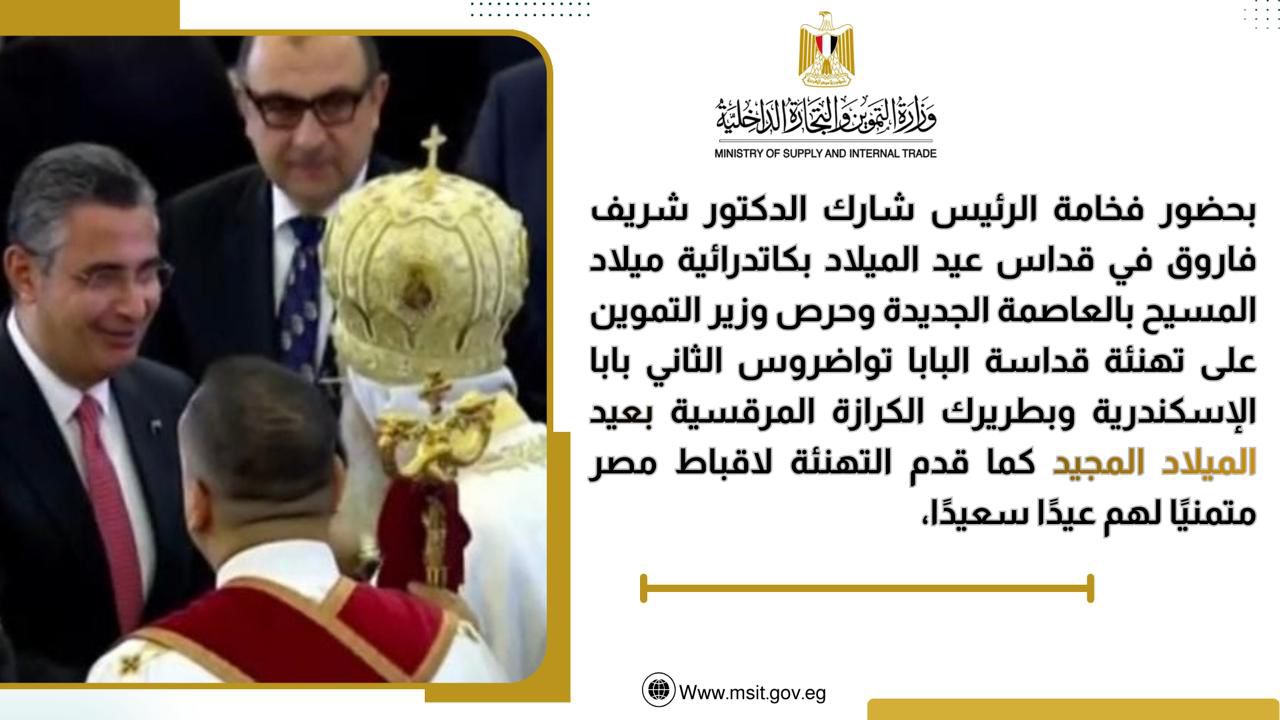 بحضور فخامة الرئيس، شارك الدكتور شريف فاروق في قداس عيد الميلاد بكاتدرائية ميلاد المسيح بالعاصمة الجديدة، وحرص وزير التموين على تهنئة قداسة البابا تواضروس الثاني، بابا الإسكندرية وبطريرك الكرازة المرقسية بعيد الميلاد المجيد، كما قدم التهنئة لاقباط مصر متمنيًا لهم عيدًا سعيدًا، مشيرًا إلى أن هذه المناسبات الدينية تمثل فرصة لتأكيد وحدة النسيج الوطني.