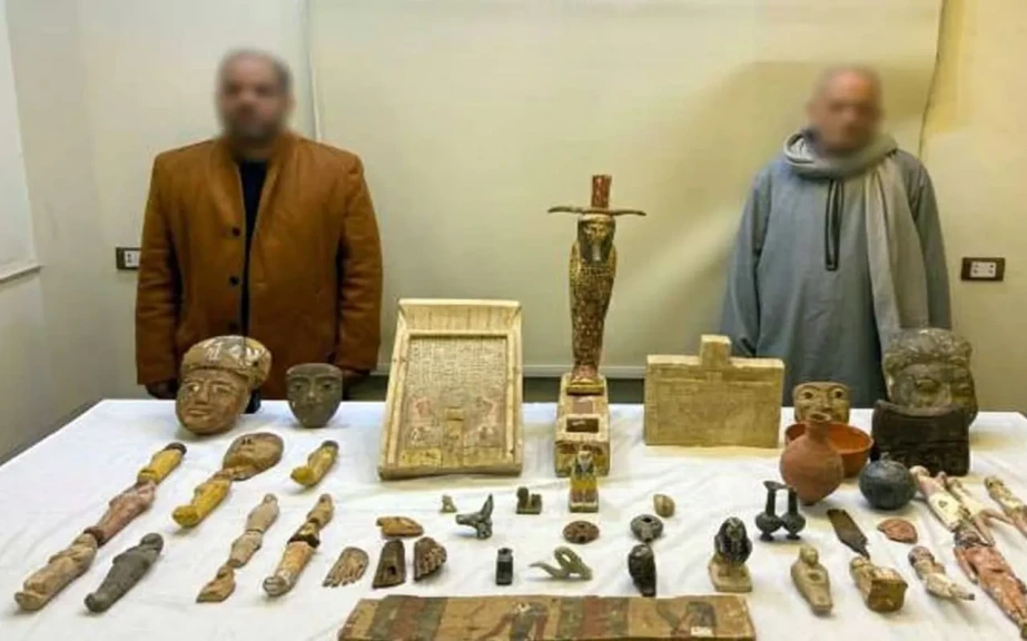عقب تقنين الإجراءات تم إستهدافهما وأمكن ضبطهما وبحوزتهما 53 قطعة أثرية متنوعة وبمواجهتهما إعترفا بأن القطع الأثرية المضبوطة نتاج أعمال الحفر والتنقيب عن الآثار بإحدى المناطق بدائرة قسم شرطة القوصية بأسيوط وحيازتهما لها بقصد الإتجار فيها وبعرض المضبوطات على مفتشى الآثار تبين أن جميع المضبوطات أثرية وتعود لعصر الدولة المصرية القديمة تم إتخاذ الإجراءات القانونية