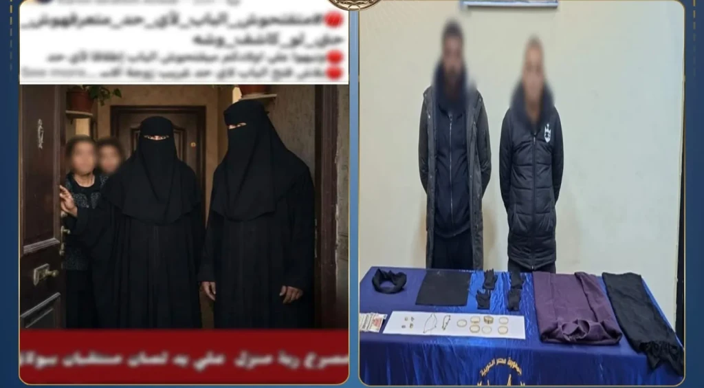 فى إطار كشف ملابسات ما تم تداوله على عدد من الصفحات بمواقع التواصل الإجتماعى يتضمن التحذير من عنصرين إجراميين يرتديان الملابس النسائية والنقاب لقيامهما بسرقة أحد المنازل بالإكراه وقتل مالكته بالفحص تبين أن حقيقة الواقعة تتمثل فى أنه بتاريخ 18 الجارى تبلغ لقسم شرطة بولاق الدكرور بالجيزة بوفاة إحدى السيدات مقيمة بدائرة القسم وسرقة منزلها بالإكراه ، وبسؤال كريمتها قررت بأنها حال تواجدها رفقة والدتها المتوفاة بالشقة محل سكنهما فوجئتا بطرق باب الشقة ولدى قيامها بفتح الباب دلف شخصان يرتديان "ملابس نسائية ونقاب" وقاما بالتعدى عليها ووالدتها بالضرب وتقييدهما ، مما أسفر عن وفاة والدتها وقيامهما بسرقة بعض المبالغ المالية ومشغولات ذهبية ولاذا بالفرار