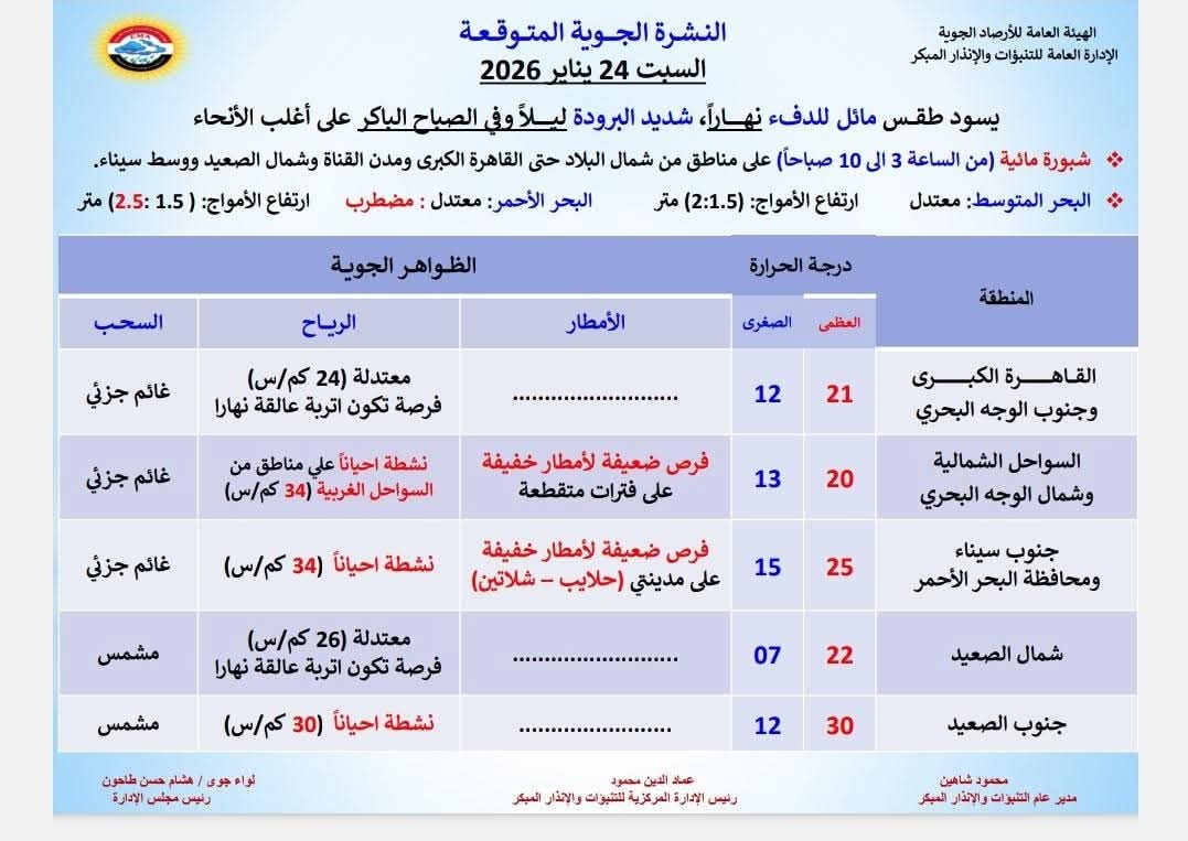 تعرف على درجات الحرارة والظواهر الجوية المتوقعة ليوم غدٍ السبت ٢٤ يناير بجميع محافظات الجمهورية