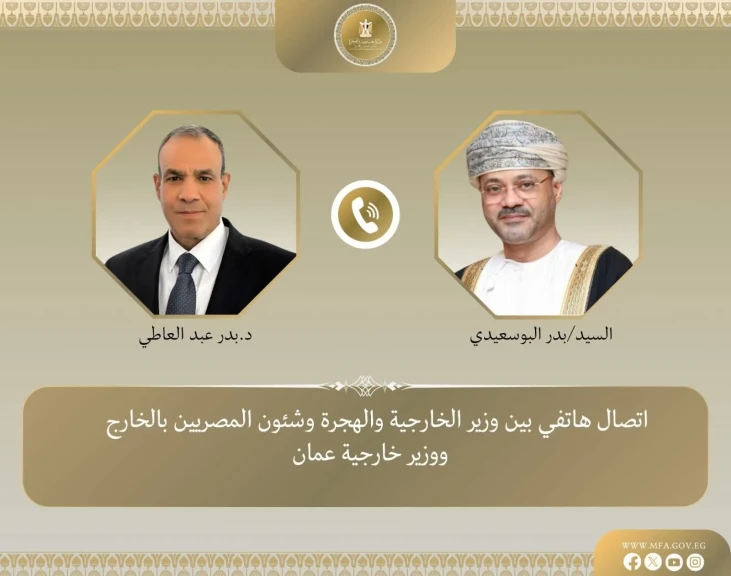 جرى اتصال هاتفي بين د. بدر عبد العاطي وزير الخارجية والهجرة وشئون المصريين بالخارج، اليوم الاربعاء ٢٨ يناير ٢٠٢٦، والسيد بدر بن حمد بن حمود البوسعيدي وزير خارجية سلطنة عُمان الشقيقة، وذلك في إطار التشاور والتنسيق المستمر بين البلدين الشقيقين.