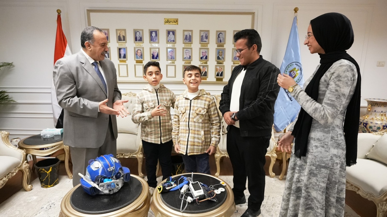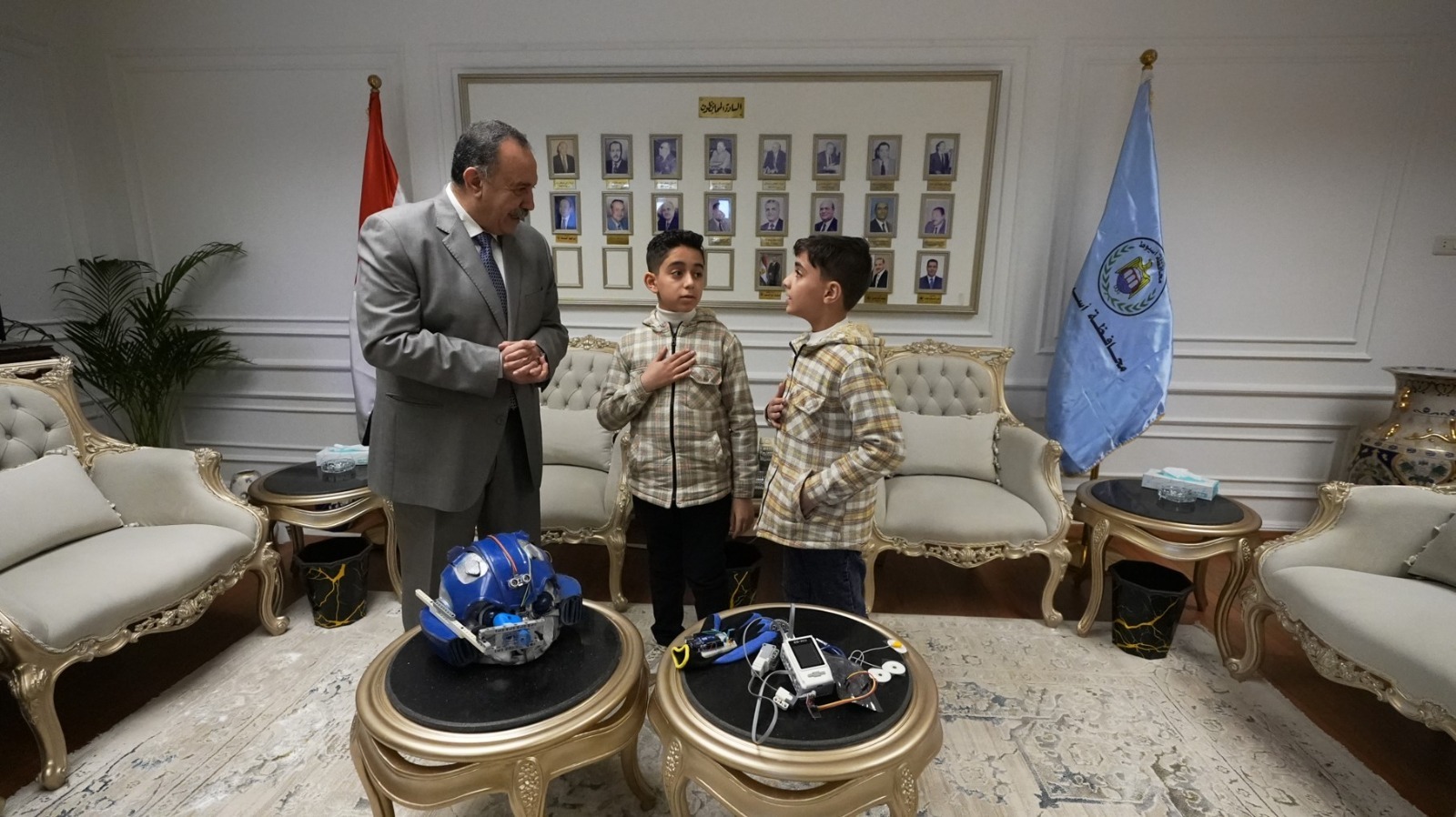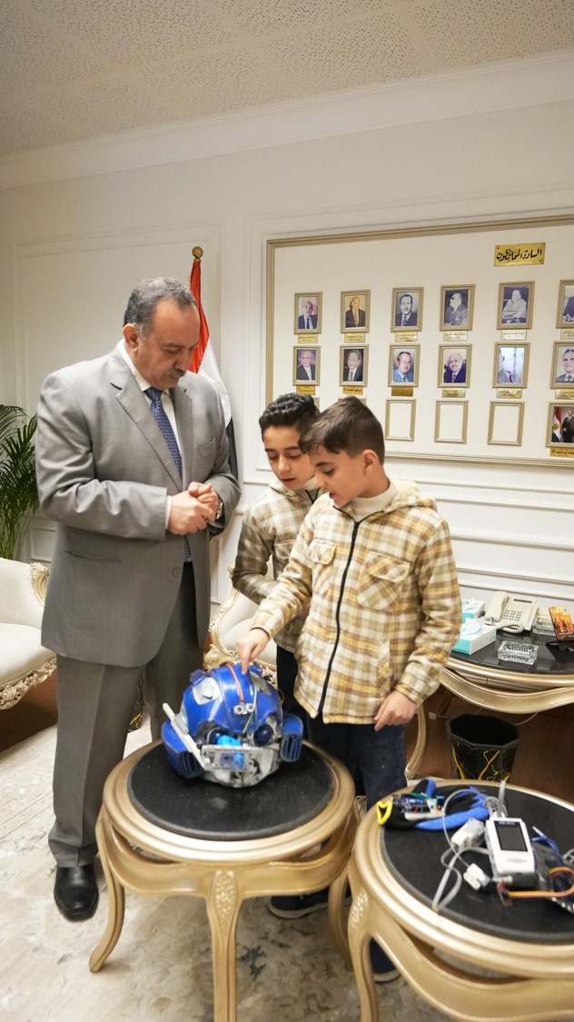 أستقبل اللواء دكتور هشام أبو النصر، محافظ أسيوط، بمكتبه بديوان عام المحافظة، طالبين من المرحلة الابتدائية، يرافقهما المدربون القائمون على تدريبهم، وذلك تقديرًا لتميزهما في مجالات الروبوتات والبرمجة والذكاء الاصطناعي، وفي إطار حرص الدولة على دعم ورعاية النشء الموهوب، واستمرارًا لنهج محافظة أسيوط في اكتشاف العقول المبدعة وتشجيع الابتكار، بحضور محمد إبراهيم دسوقي وكيل وزارة التربية والتعليم.