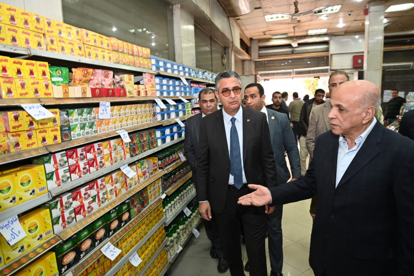 ورافق الوزير خلال الجولة الدكتور علاء ناجي العضو المنتدب الرئيس التنفيذي للشركة القابضة للصناعات الغذائية، والأستاذ أحمد كمال مساعد الوزير والمتحدث الرسمي للوزارة، والمهندس عبد الباسط عبد النعيم مدير مديرية تموين القاهرة.