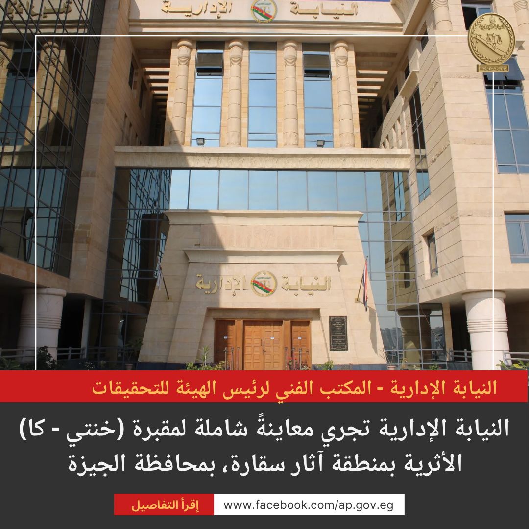 تنفيذًا لتوجيهات معالي المستشار/ محمد الشناوي - رئيس هيئة النيابة الإدارية؛ واستكمالًا للتحقيقات التي يجريها المكتب الفني لرئيس الهيئة للتحقيقات برئاسة المستشار/ خيري معوض، أجرى المستشار/ وائل عزت التوني، وتحت إشراف المستشار/ محمد حامد - وكيل المكتب، صباح اليوم الأربعاء الموافق الحادي عشر من فبراير الجاري؛ معاينةً شاملة لمقبرة (خنتي - كا) الأثرية بمنطقة آثار سقارة، بمحافظة الجيزة.
