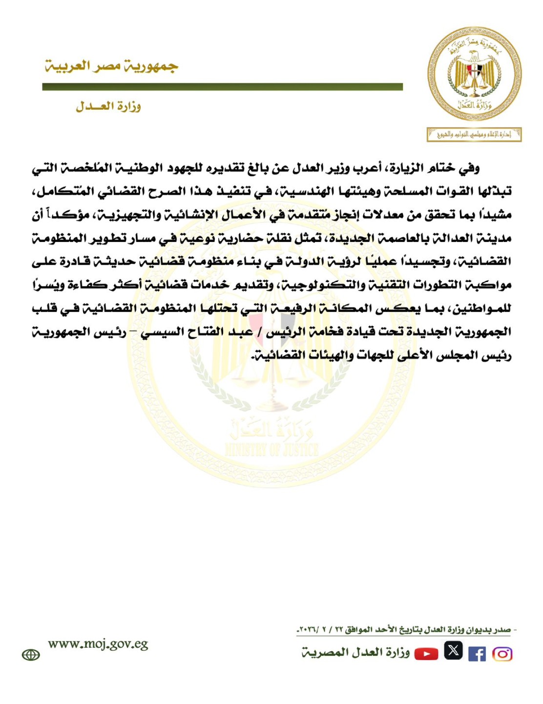 وفي ختام الزيارة، أعرب وزير العدل عن بالغ تقديره للجهود الوطنية المُلخصة التي تبذُلها القوات المسلحة وهيئتها الهندسية، في تنفيذ هذا الصرح القضائي المُتكامل، مشيدًا بما تحقق من معدلات إنجاز مُتقدمة في الأعمال الإنشائية والتجهيزية، مؤكداً أن مدينة العدالة بالعاصمة الجديدة، تُمثل نقلة حضارية نوعية في مسار تطوير المنظومة القضائية، وتجسيدًا عمليًا لرؤية الدولة في بناء منظومة قضائية حديثة قادرة على مواكبة التطورات التقنية والتكنولوجية، وتقديم خدمات قضائية أكثر كفاءة ويُسرًا للمواطنين، بما يعكس المكانة الرفيعة التي تحتلها المنظومة القضائية في قلب الجمهورية الجديدة تحت قيادة الرئيس عبد الفتاح السيسي، رئيس الجمهورية رئيس المجلس الأعلى للجهات والهيئات القضائية.