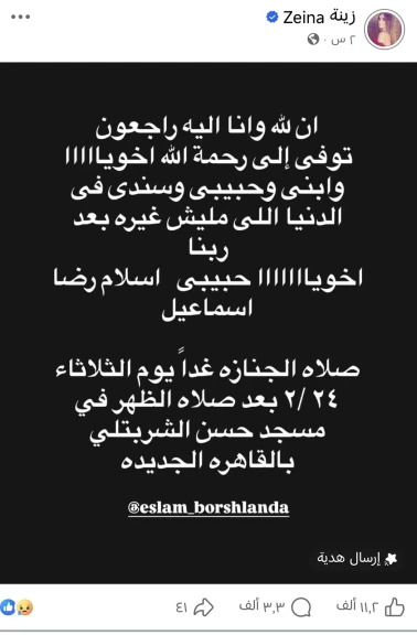 "إنّا لله وإنّا إليه راجعون.. توفي إلى رحمة الله أخويا وابني وحبيبي وسندي في الدنيا اللي مليش غيره بعد ربنا.. أخويا حبيبي إسلام رضا إسماعيل".