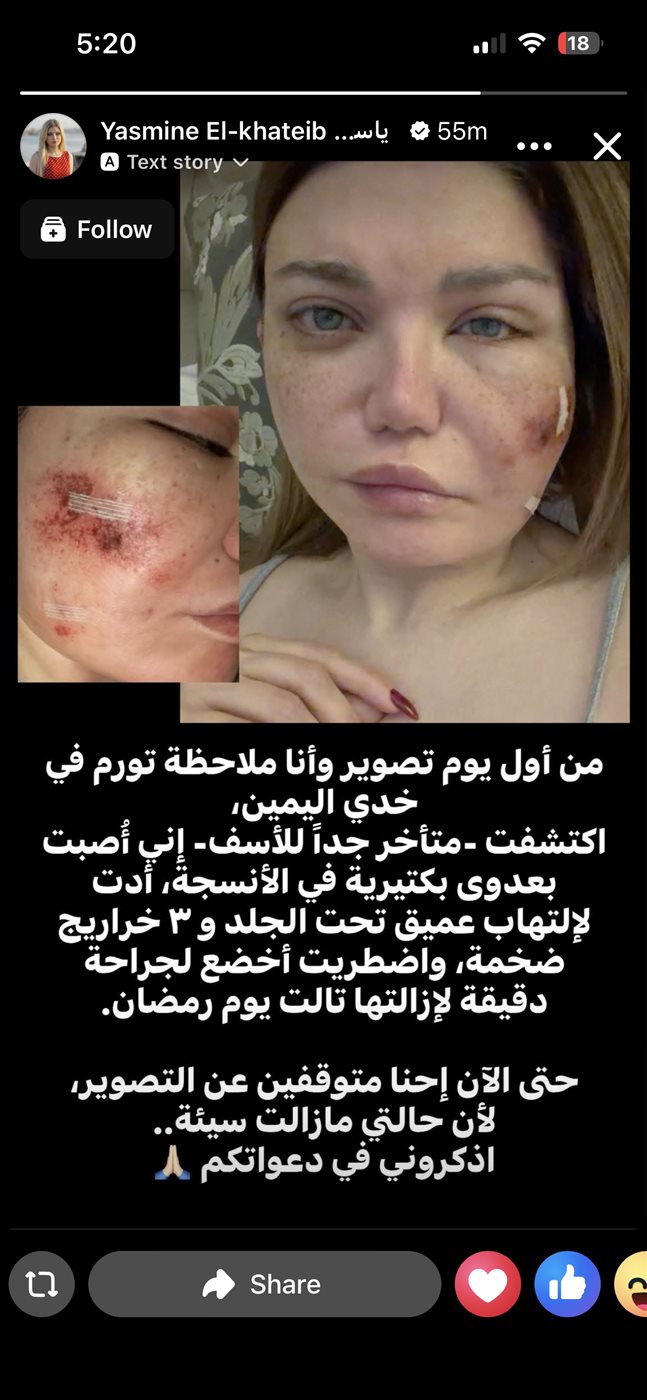 ياسمين الخطيب تخضع لجراحة دقيقة بعد إصابتها بعدوى بكتيرية في الوجه