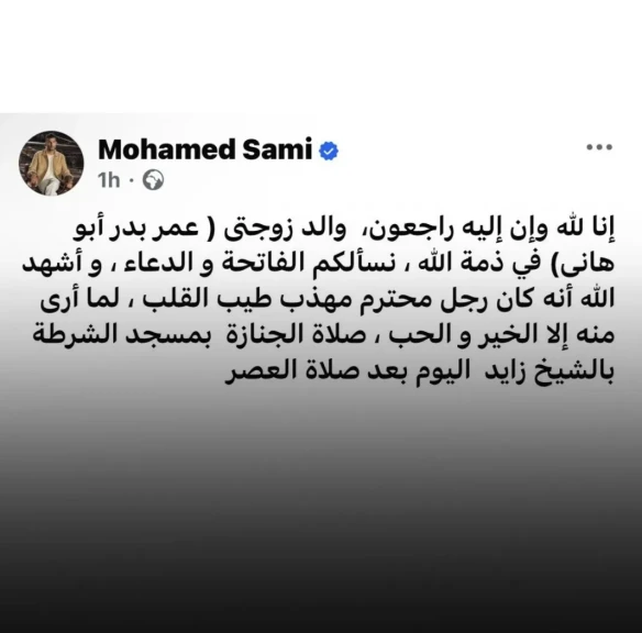 "إنا لله وإنا إليه راجعون، والد زوجتي (عمر بدر أبو هاني) في ذمة الله، نسألكم الفاتحة والدعاء، وأشهد الله أنه كان رجلًا محترمًا مهذبًا طيب القلب، لم أرَ منه إلا الخير والحب. صلاة الجنازة بمسجد الشرطة بالشيخ زايد اليوم بعد صلاة العصر."