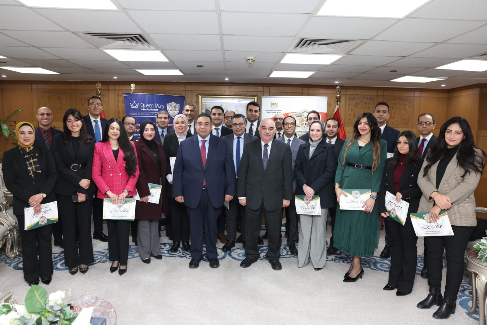 اقيم ظهر اليوم بمقر مركز الدراسات القضائية والتدريب والتعاون الدولي والثقافي بهيئة قضايا الدولة بالمهندسين، حفل تسليم شهادات برنامج «القانون الدولي للاستثمار والتحكيم» (دفعتا 2024و2025)، والذي نُفِّذ بالتعاون مع مركز دراسات القانون التجاري بـQueen Mary University of London.