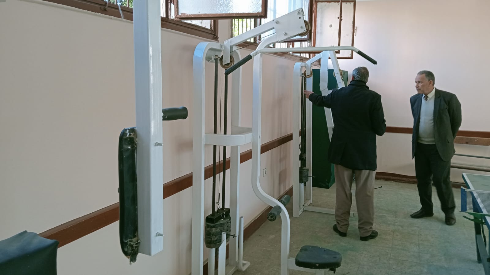 حيث تابع وكيل الوزارة أعمال تجهيز صالة الألعاب الرياضية واللياقة البدنية بالمدرسة وشاهد تركيب بعض الأجهزة الرياضية وترابيزات تنس الطاولة .