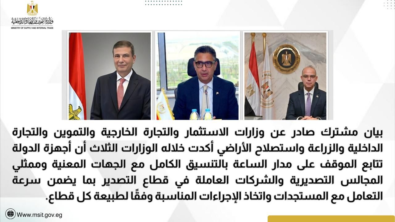 🔹 بيان مشترك صادر عن وزارات الاستثمار والتجارة الخارجية، والتموين والتجارة الداخلية، والزراعة واستصلاح الأراضي