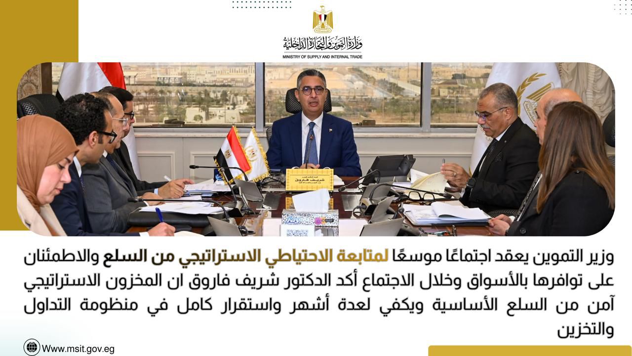 في إطار المتابعة المستمرة لموقف توافر السلع الاستراتيجية في ظل تطورات الأحداث الإقليمية الراهنة، عقد الدكتور شريف فاروق، وزير التموين والتجارة الداخلية، اجتماعًا موسعًا لمتابعة موقف الاحتياطي الاستراتيجي من السلع الأساسية، والاطمئنان على توافرها بالأسواق ومعدلات الضخ والتداول والتخزين، إلى جانب متابعة موقف مخزون القمح والحبوب.