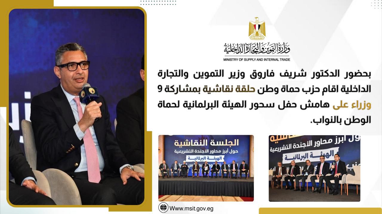 بحضور الدكتور شريف فاروق وزيرالتموين والتجارة الداخلية، اقام حزب حماة وطن حلقة نقاشية بمشاركة 9 وزراء على هامش حفل سحور الهيئة البرلمانية لحماة الوطن بالنواب.