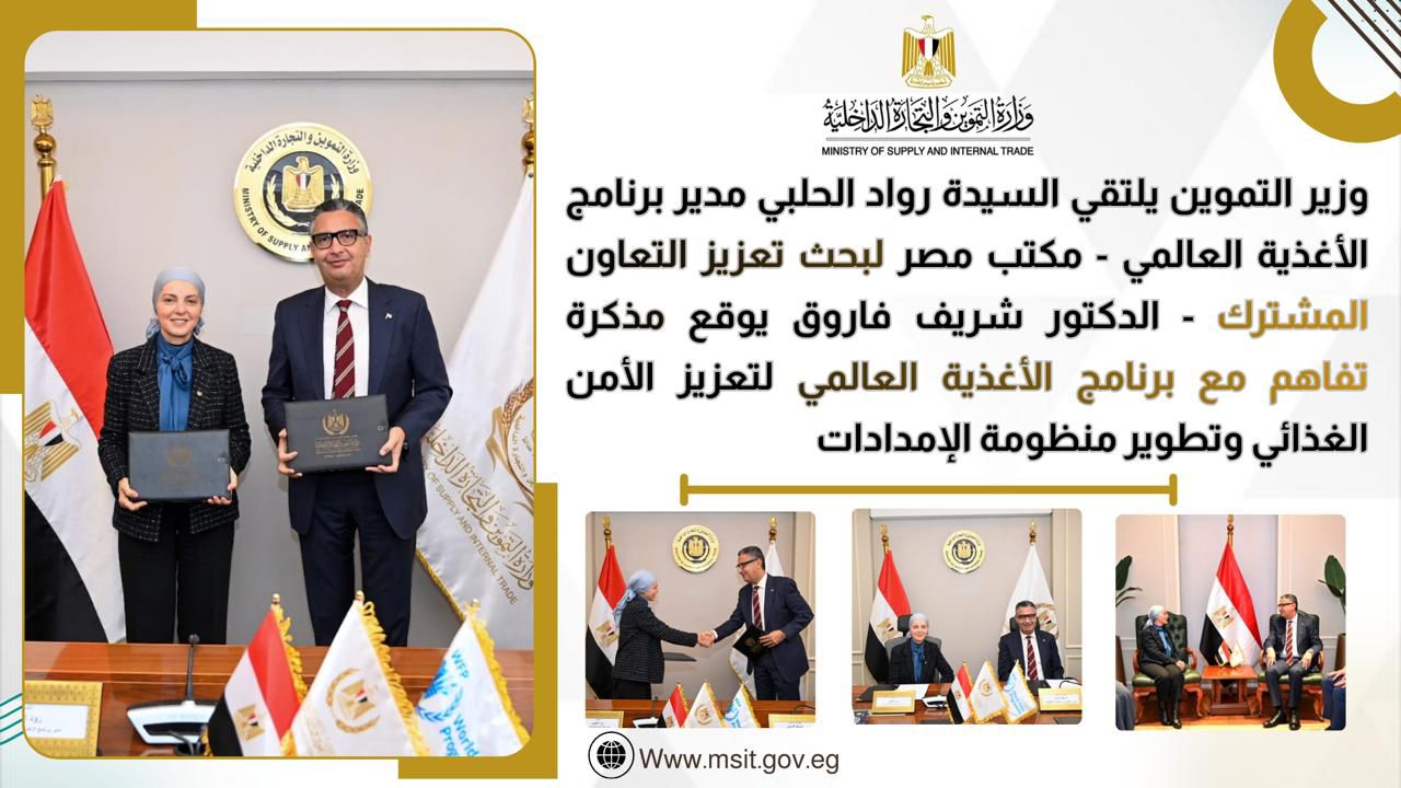 استقبل الدكتور شريف فاروق، وزير التموين والتجارة الداخلية، السيدة رواد الحلبي، مدير برنامج الأغذية العالمي – مكتب مصر، حيث تم بحث سبل تعزيز التعاون المشترك بين الجانبين، وتوقيع مذكرة تفاهم لتوسيع آفاق الشراكة خلال الفترة من مارس 2026 حتى يونيو 2028.