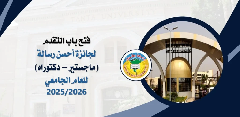 أعلن الدكتور محمد حسين رئيس جامعة طنطا عن فتح باب التقدم للحصول على جوائز أحسن رسالة (ماجستير - دكتوراه) للعام الجامعي 2025/2026 وعددها 12 جائزة، وذلك خلال الفترة من الأول من مارس حتى 15 إبريل.