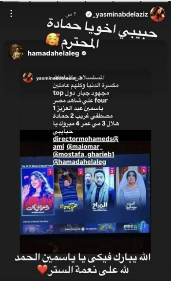 ولم يتأخر الفنان حمادة هلال في التفاعل مع المنشور، حيث نشر عبر خاصية الاستوري على حسابه في إنستجرام رسالة تهنئة قال فيها: