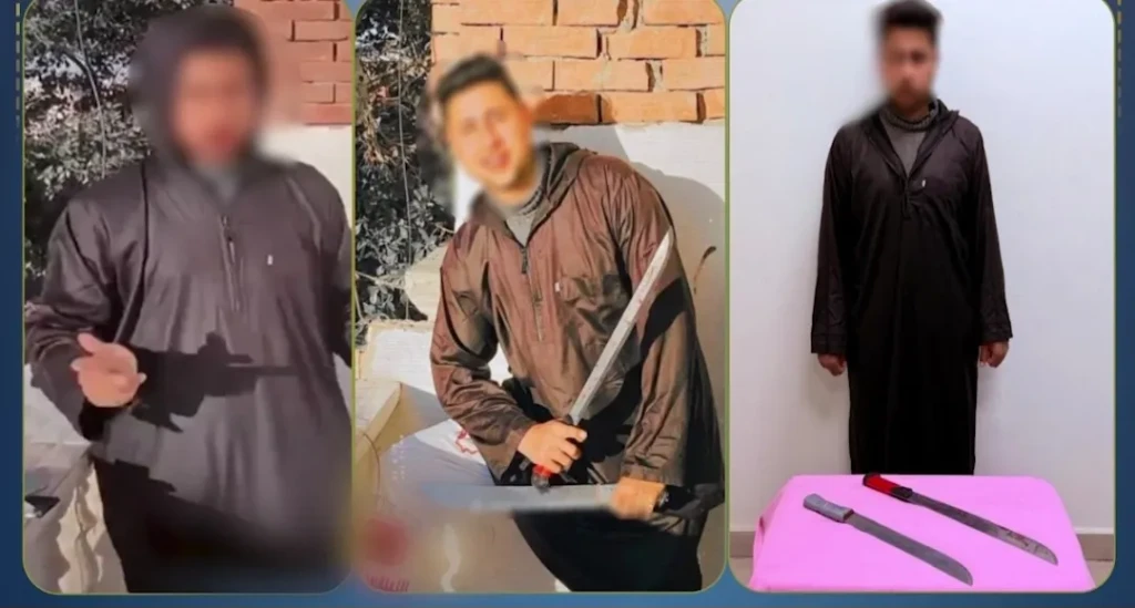 بالفحص أمكن تحديد وضبط صاحب الحساب المشار إليه عاطل مقيم بمحافظة بنى سويف وبحوزته (الأسلحة البيضاء الظاهرة بالصورة المُشار إليها) وبمواجهته إعترف بنشره الصورة ومقطع الفيديو المُشار إليهما على صفحته بمواقع التواصل الإجتماعى بقصد الإستعراض وتحقيق نسب مشاهدات مرتفعة وحذفه المقطع عقب ذلك خشية تعرضه للمساءله .