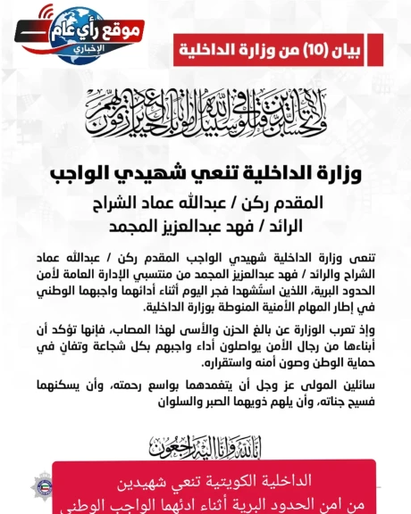 وزارة الداخلية الكويتية تنعى شهيدي الواجب من أمن الحدود البرية
