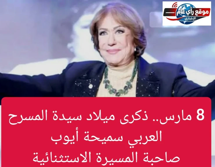 تحل اليوم 8 مارس ذكرى ميلاد الفنانة الكبيرة الراحلة سميحة أيوب، التي تُعد واحدة من أبرز رموز الفن في مصر والعالم العربي، حيث لقبت بـ “سيدة المسرح العربي” بعد مسيرة فنية استثنائية امتدت لنحو 77 عامًا، تركت خلالها بصمة لا تُنسى في المسرح والسينما والتلفزيون.