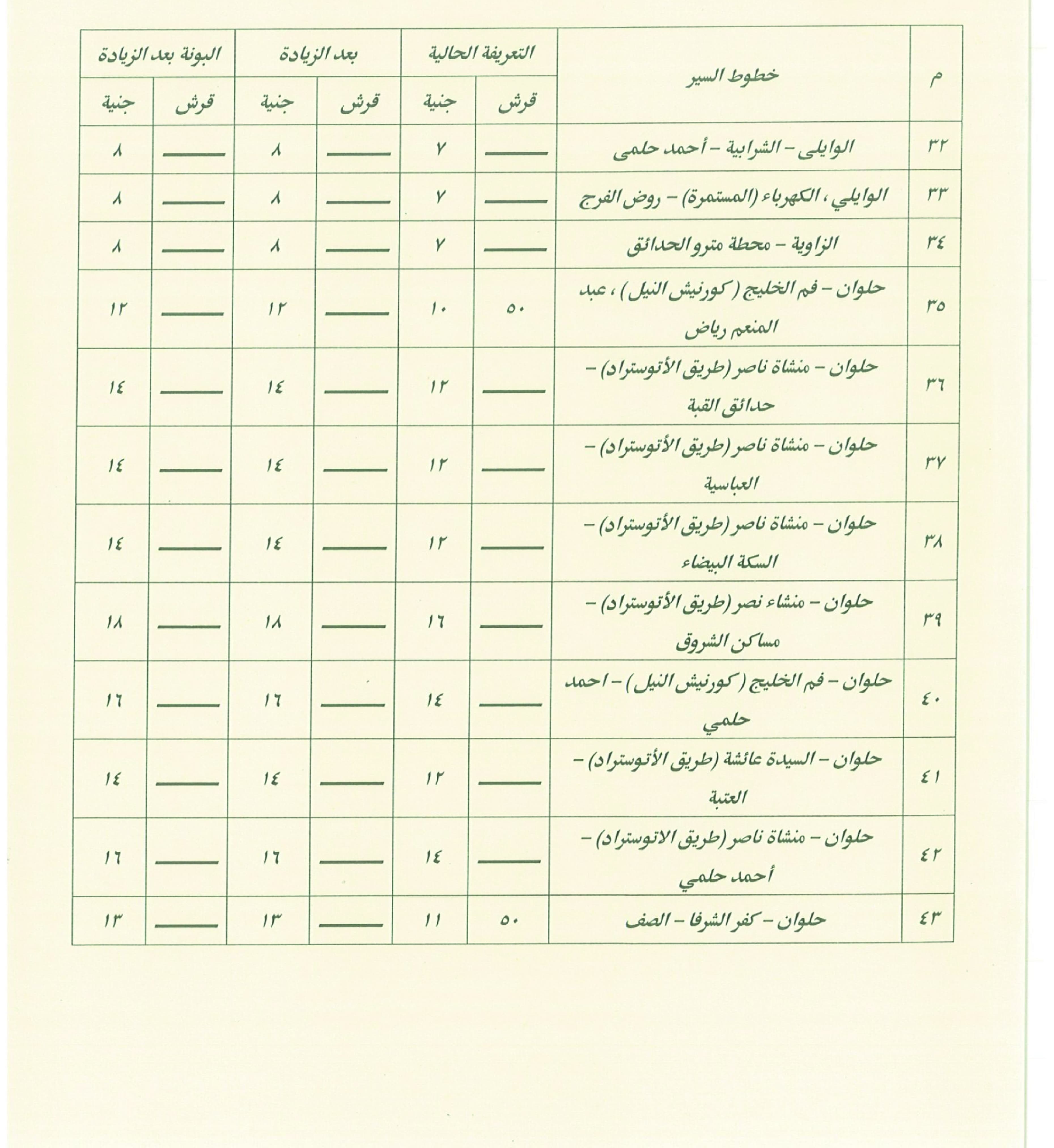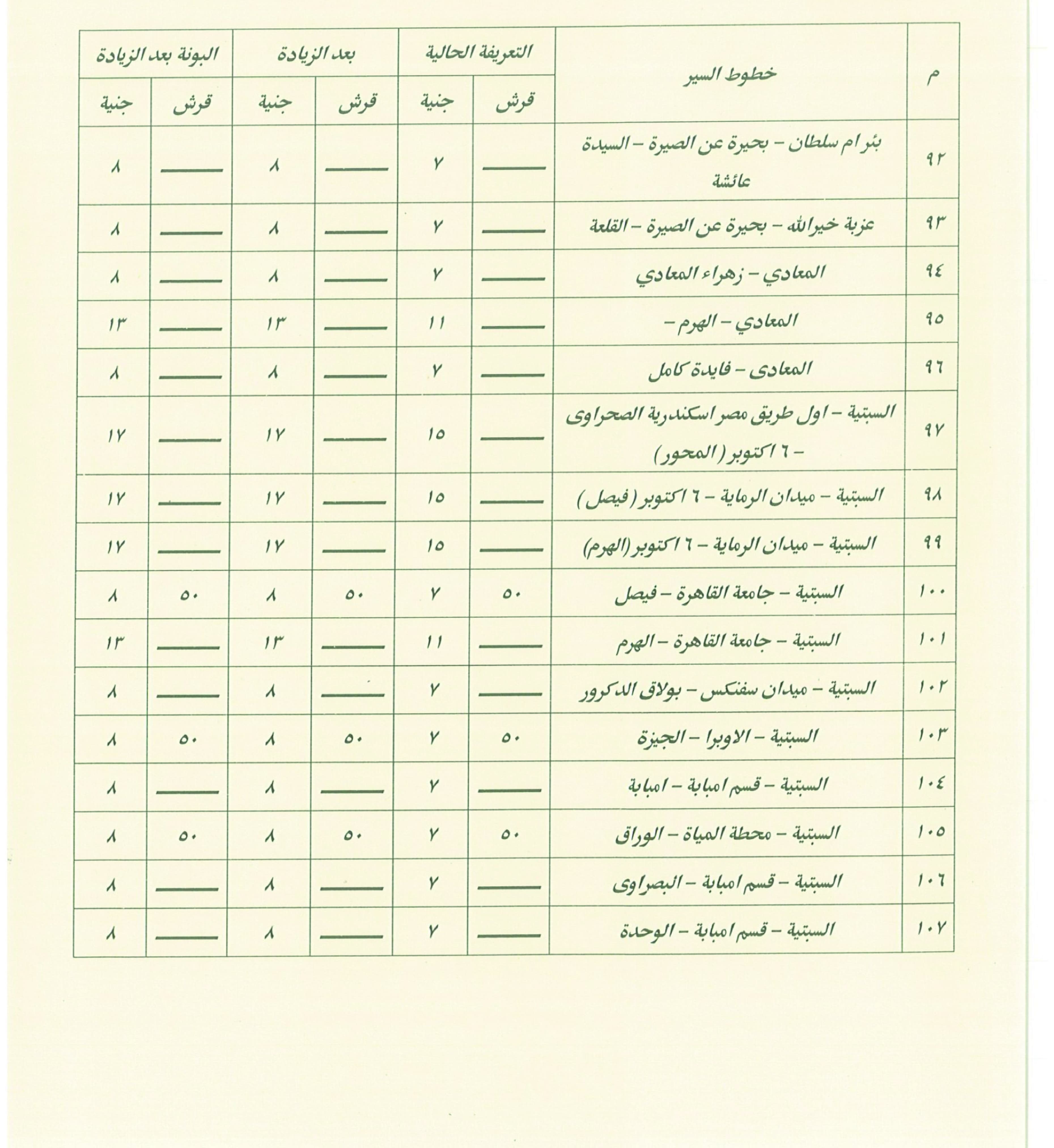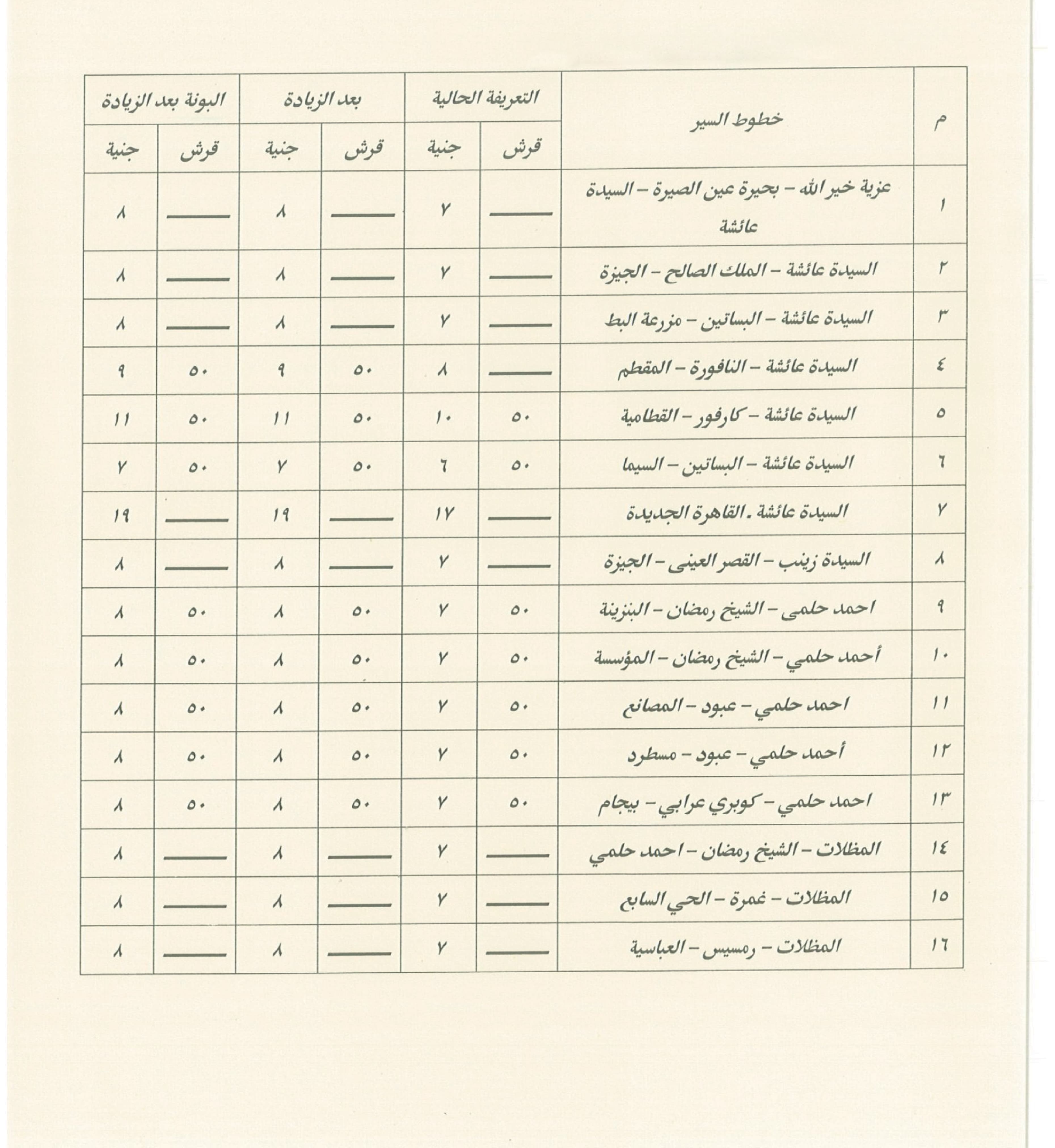 وأكد الدكتور إبراهيم صابر، محافظ القاهرة، أنه تم عند وضع التعريفة الجديدة مراعاة مسافة كل خط سير وعدد الرحلات، بما يحقق العدالة بين المواطنين والسائقين، مشيرًا إلى أنه جرى التنسيق مع المحافظات المجاورة التي ترتبط مع القاهرة بخطوط سير مشتركة، لضمان توحيد التعريفة في الاتجاهين ومنع أي محاولات لاستغلال المواطنين.
