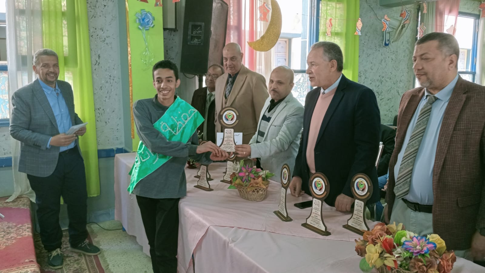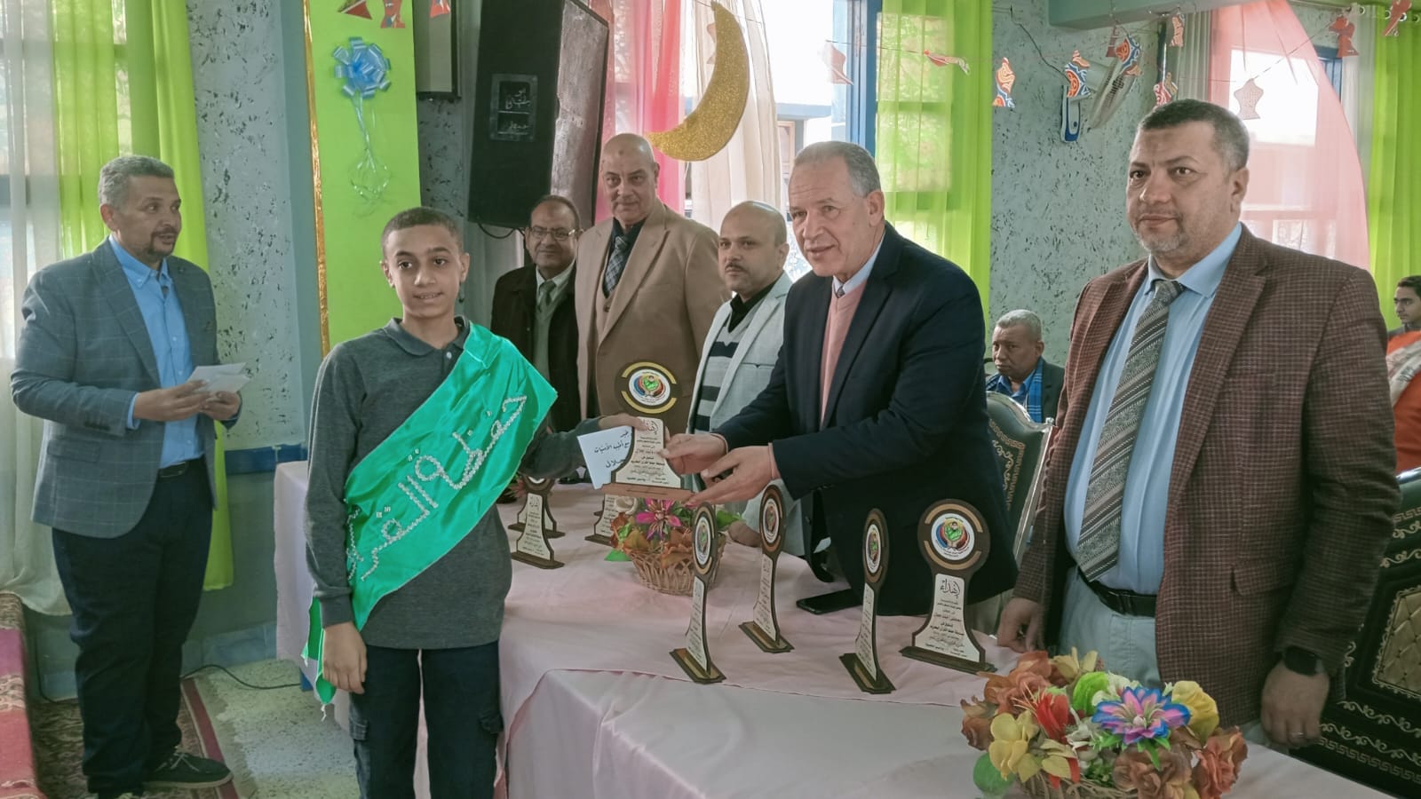 ثم كرم وكيل الوزارة الطلاب الفائزين بالمراكز الأولى فى مسابقة حفظ القران الكريم والمسابقة الثقافية الدينية بمختلف مستوياتها تحفيزا وتقديرا لهم وسلمهم الدروع التذكارية والهدايا المالية وسط جو من البهجة والسعادة من الحضور .