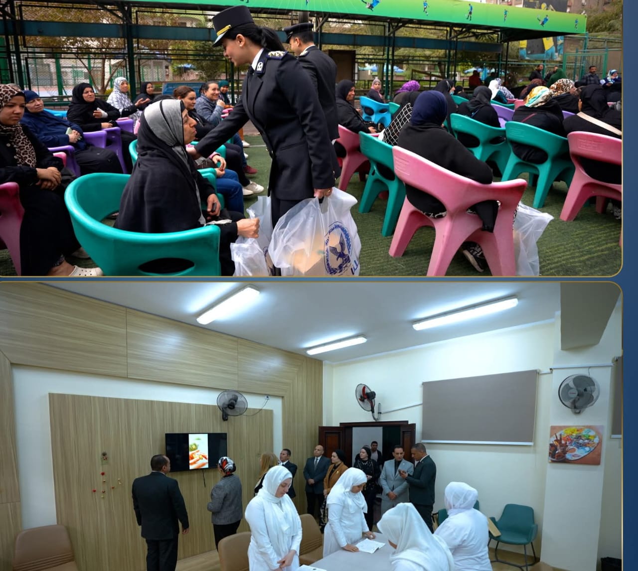 وفى ذات السياق قام وفد من قيادات وضباط وضابطات قطاع حقوق الإنسان بمشاركة إدارة حقوق الإنسان بقطاعى أمن "القاهرة ، الجيزة" بإستقبال عدداً من السيدات المعيلات والأشد إحتياجاً بمقر نادى السكة الحديد بمدينة نصر ونادى الشرقية للدخان بالهرم وإهدائهن هدايا عينية "عبوات مواد غذائية".