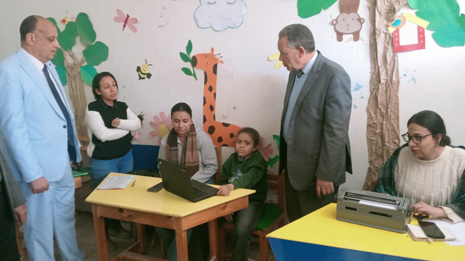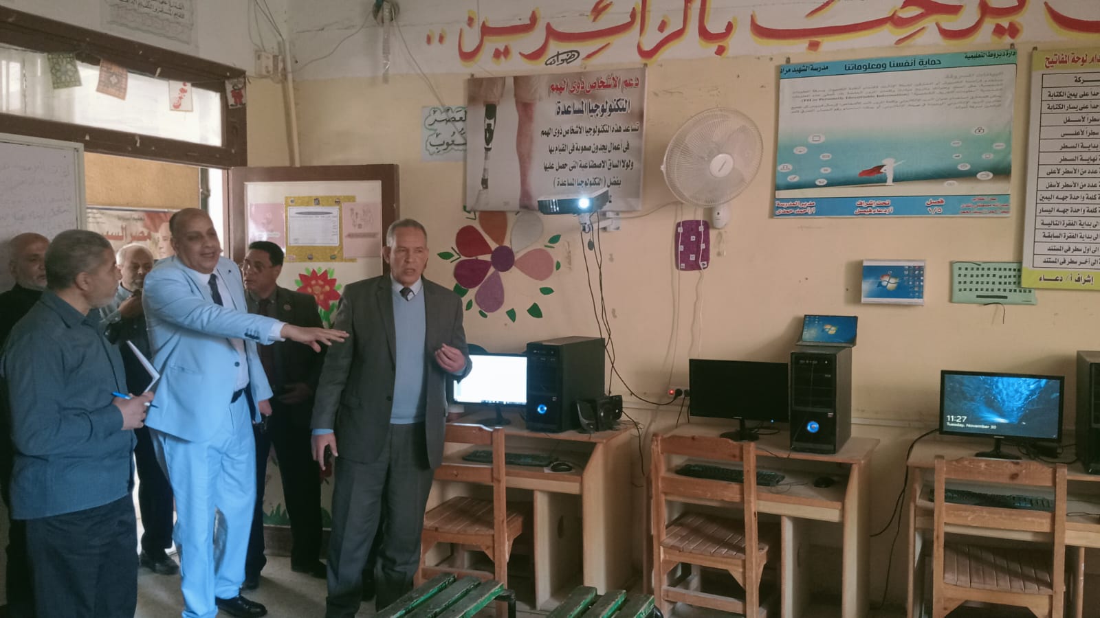 حيث التقى وكيل الوزارة خلال تفقده فصول مدرسة الشهيد مراد سيد عبد الحافظ الابتدائية بابوجبل ، البالغ عدد فصولها 24 فصل دراسى ، بعض طلاب الدمج والمشرفين عليهم داخل غرفة المصادر بالمدرسة لتدريبهم على بعض اجهزة الكتابة والحاسب الالى ضمن برامج الدمج التى يجرى تطبيقها بالتنسيق مع بعض مؤسسات المجتمع المدنى و وفقا لنوعية الإعاقة للطلاب ودرجتها .