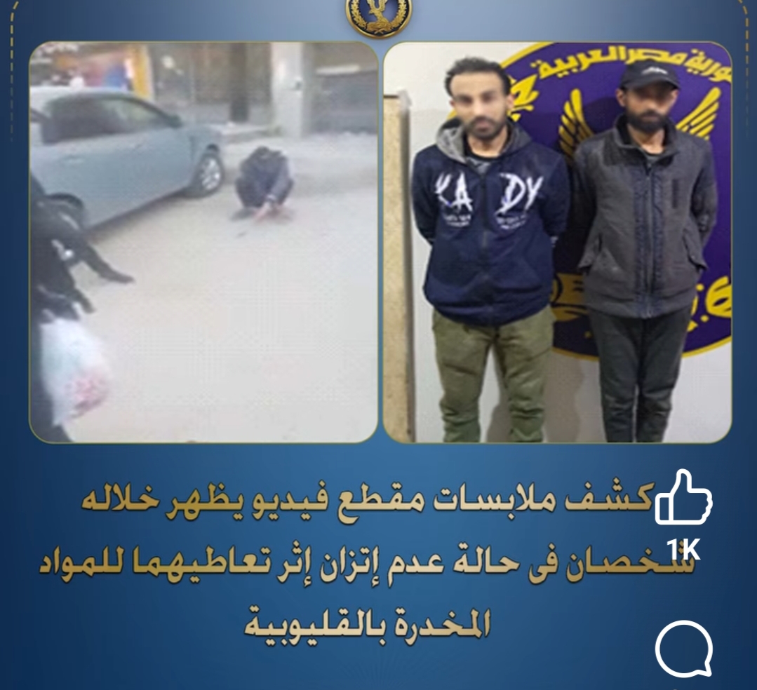 نجحت أجهزة الأمن فى كشف ملابسات مقطع فيديو تم تداوله بمواقع التواصل الإجتماعى يظهر خلاله شخصان فى حالة عدم إتزان إثر تعاطيهما للمواد المخدرة بالقليوبية بالفحص أمكن تحديد وضبط الشخصان الظاهران بمقطع الفيديو عاطلان لهما معلومات جنائية وبمواجهتهما إعترفا إنهما كانا تحت تأثير تعاطى المواد المخدرة أنذاك تم إتخاذ الإجراءات القانونية.
